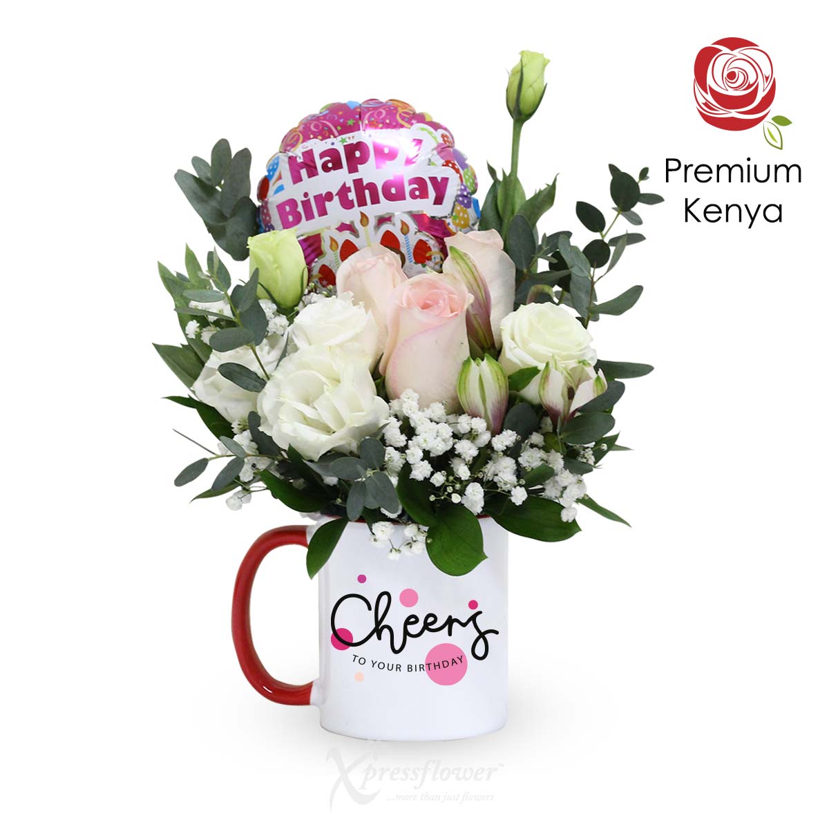 Comes with 'Cheers' mug and 'Happy Birthday' mini balloon.