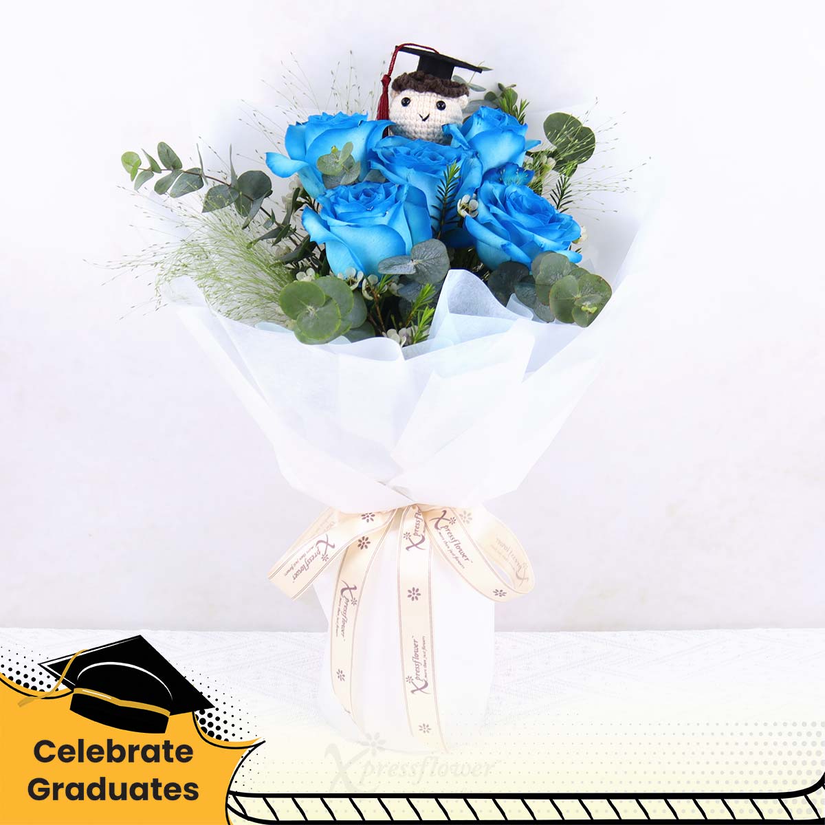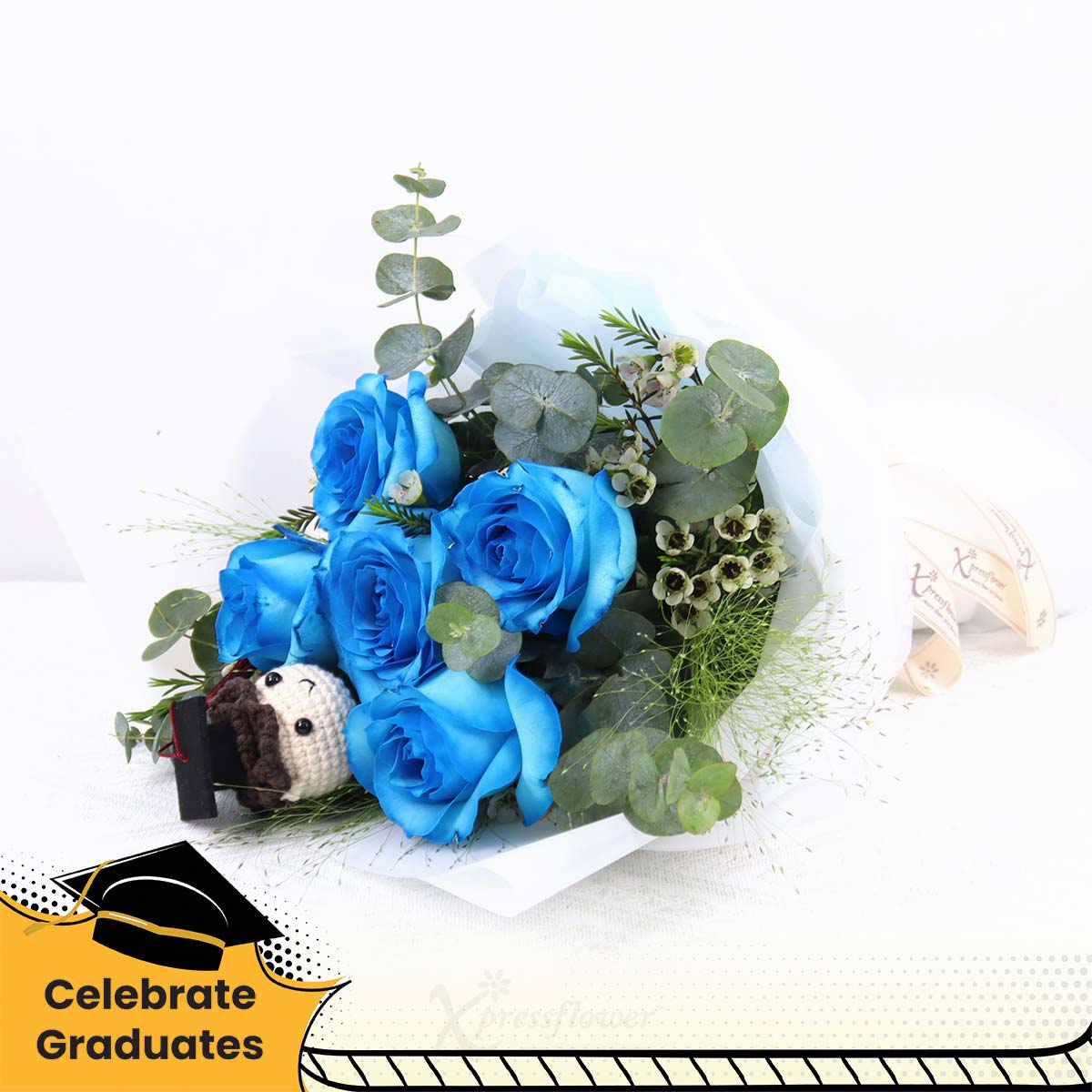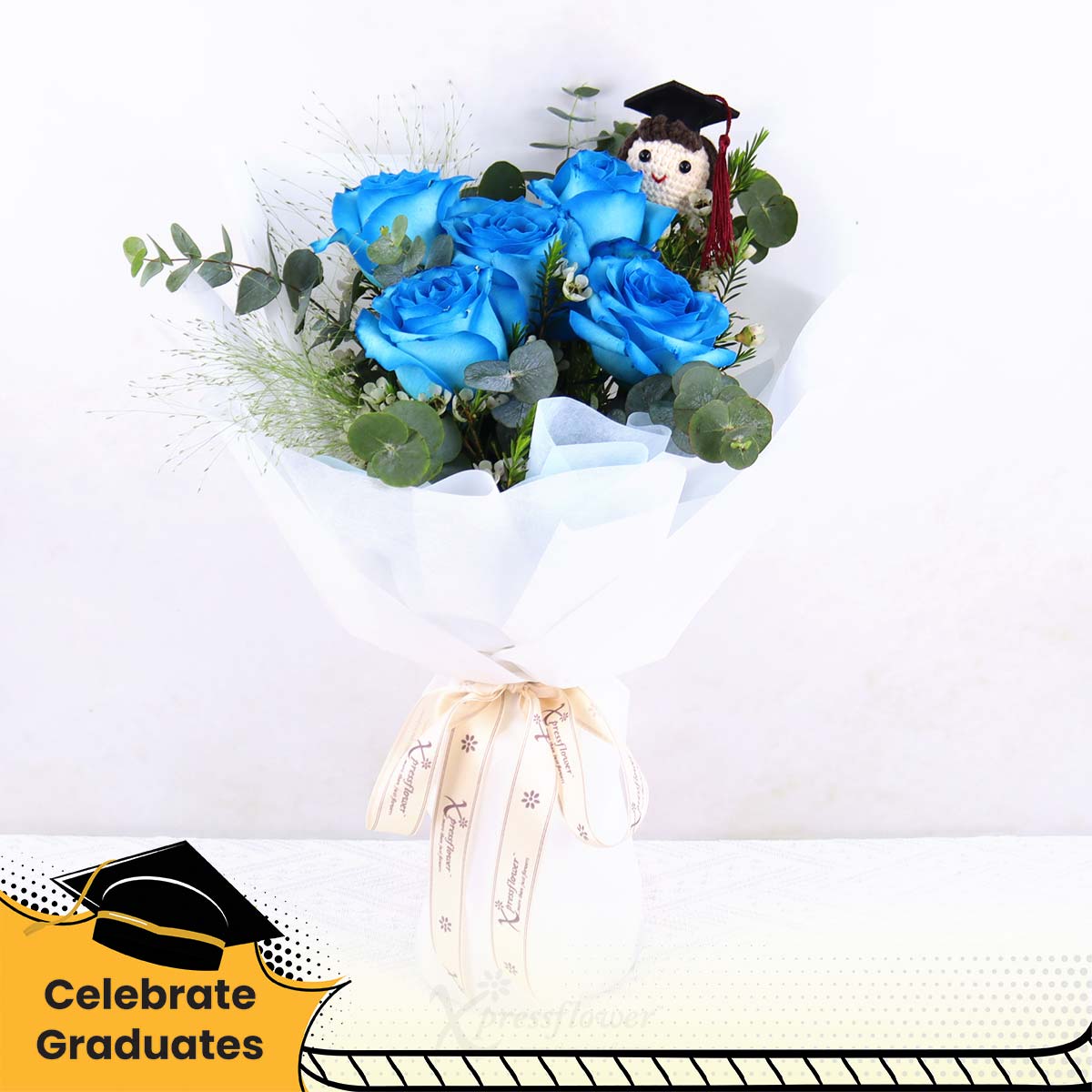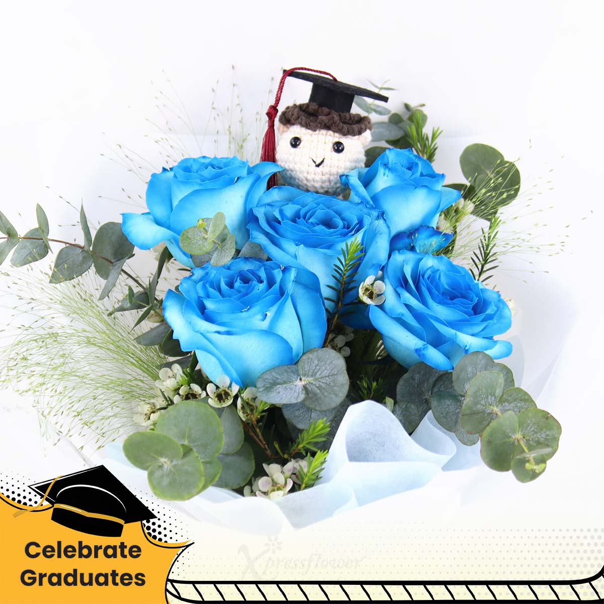 Celebrate change with confidence with this graduation bouquet. These 6 stalks blue roses symbolize courage, ambition, and fresh starts. Wrapped in airy blue-white hues and finished with your choice of male or female graduate crochet doll, this bouquet is made for milestone moments and fearless futures.