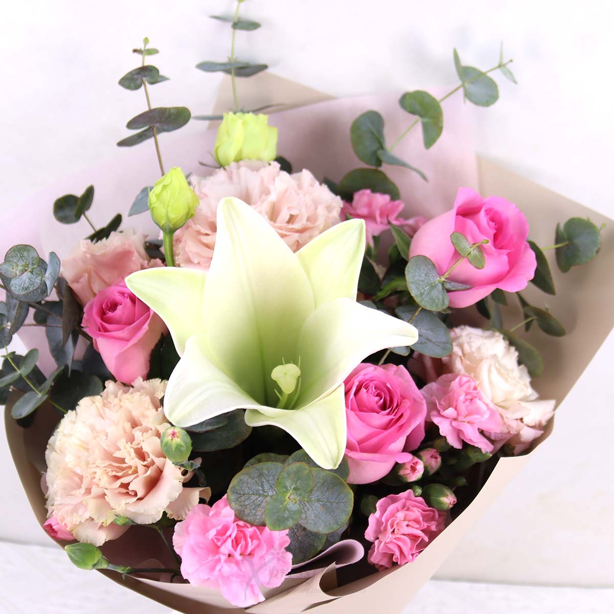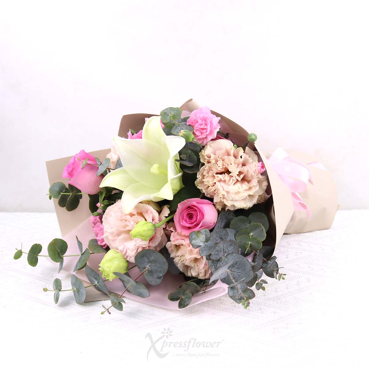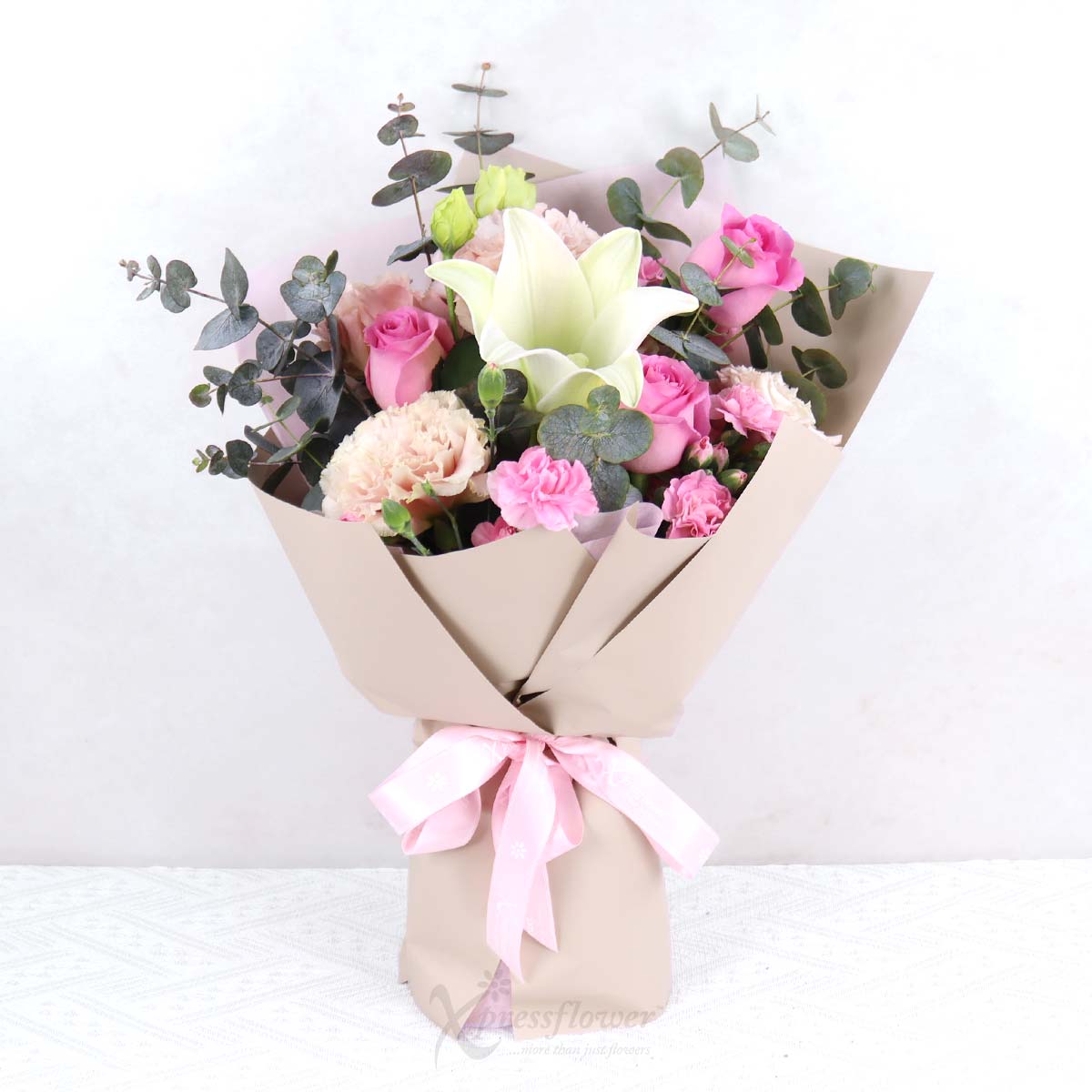 A white lily takes center stage in this beautiful bouquet, complemented with revival roses, pink carnation sprays, apricot eustomas, and eucalyptus, all wrapped in warm light brown. This is a graceful bouquet that honors enduring love with quiet beauty and heartfelt warmth.