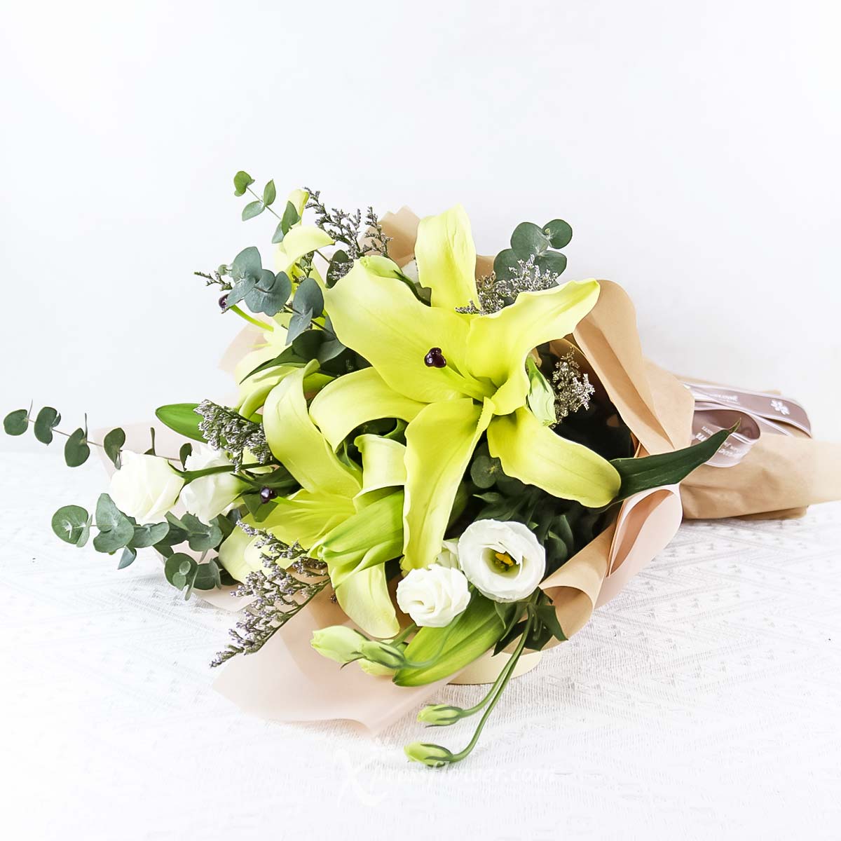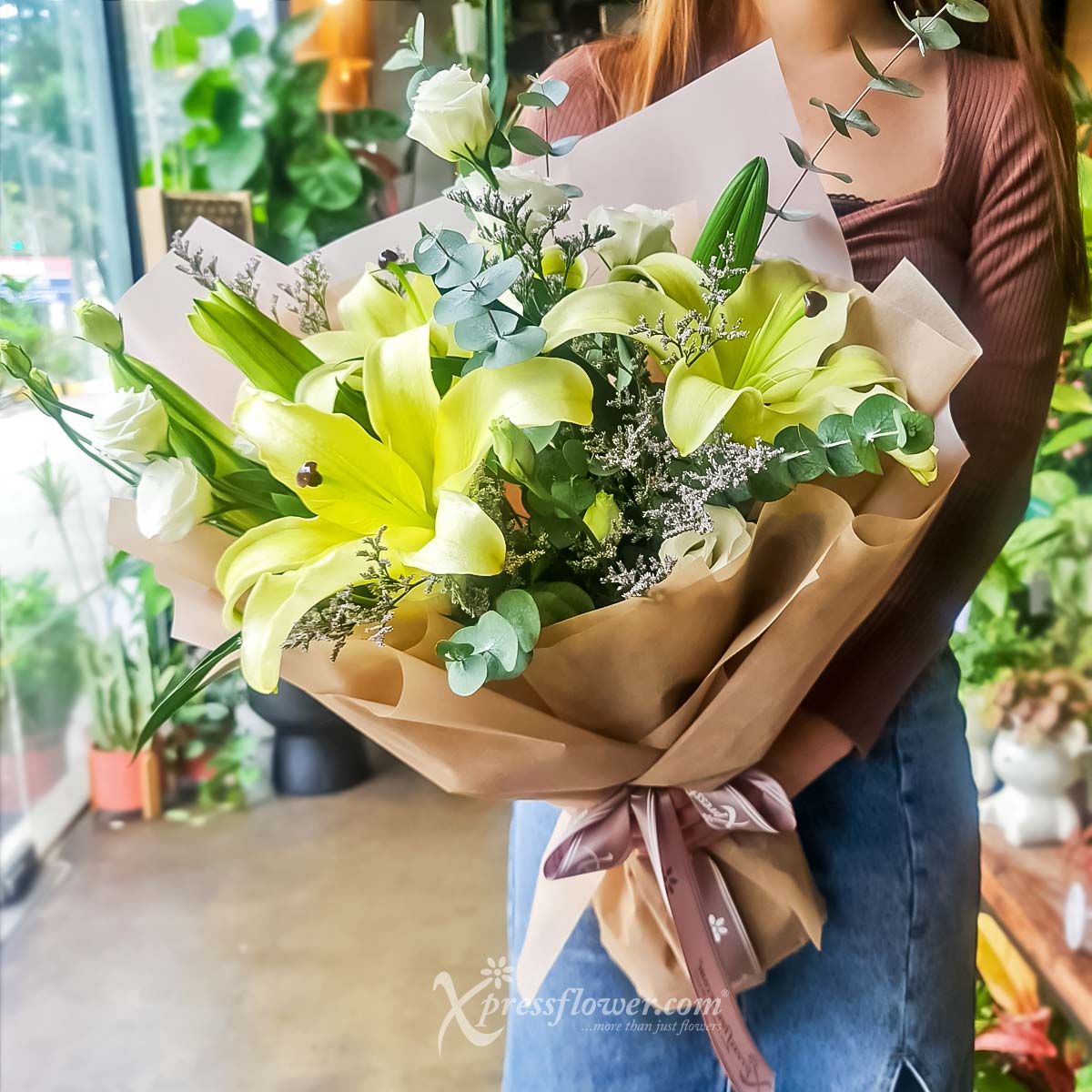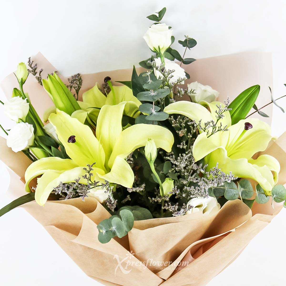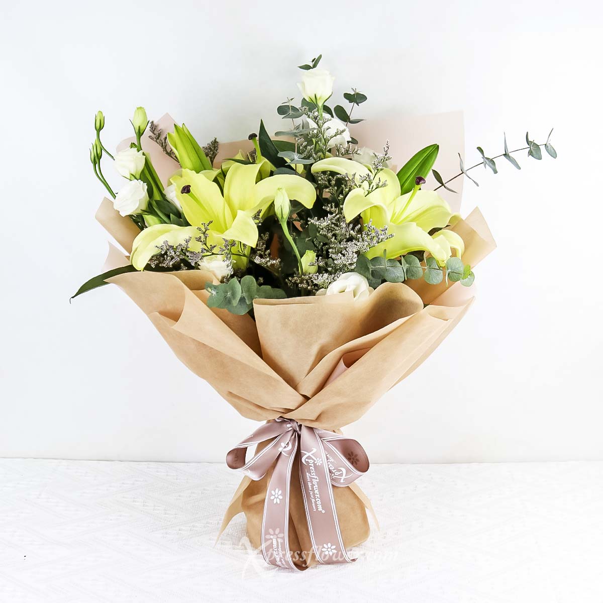 Capture the essence of joy with our fresh flower bouquet. 3 stalks vibrant yellow lily sprays mingle with pristine white eustoma, ethereal blue misty limonium, and aromatic eucalyptus cinerea. Wrapped in a rustic brown wrapper, it's a delightful ensemble symbolizing joy, gratitude, and the beauty of cherished friendships.