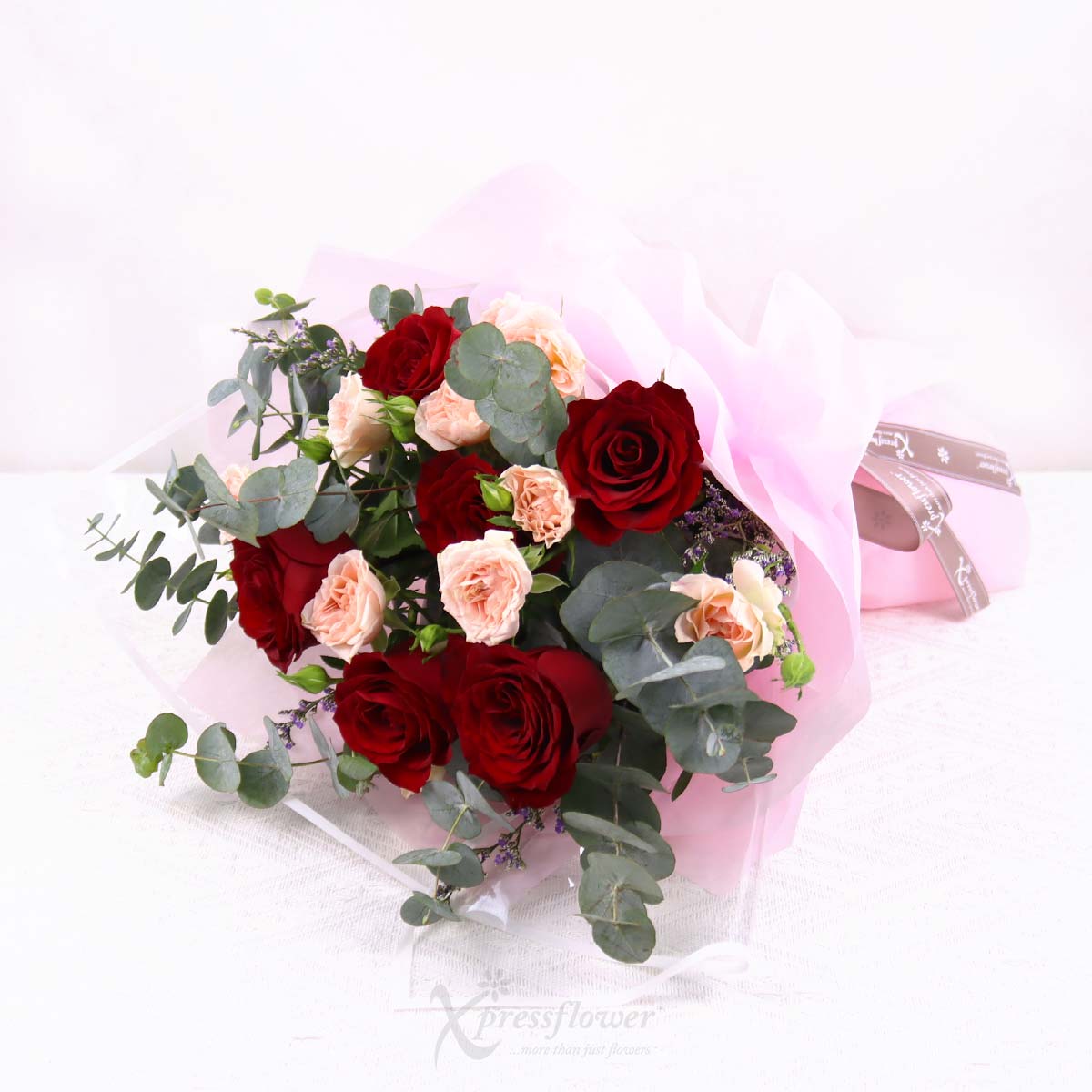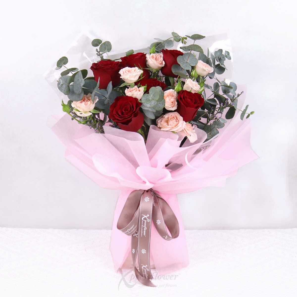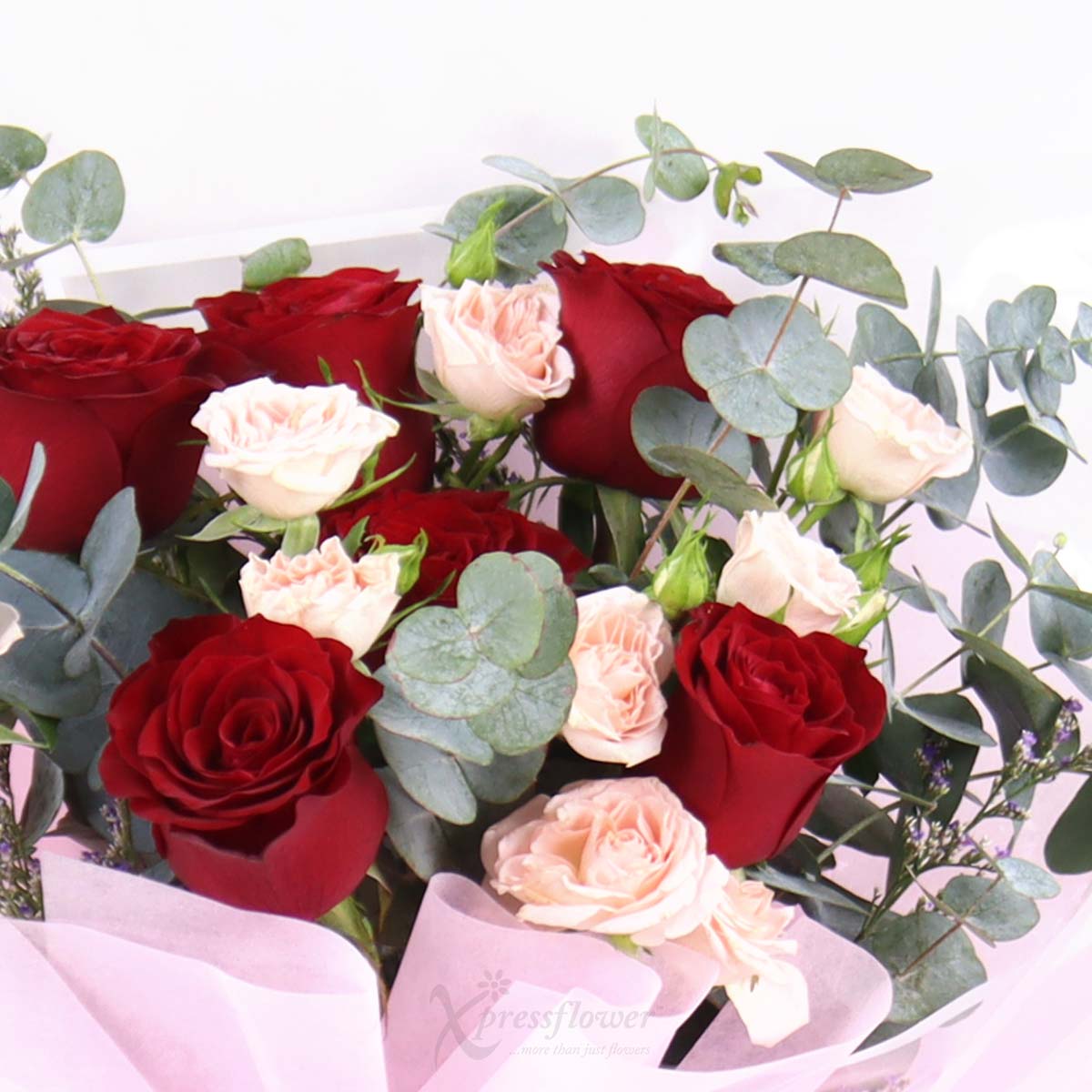 Sweep your sweetheart off their feet with this stunning fresh flower bouquet. Featuring 6 stalks vibrant red roses, symbolizing passionate love, together with other delicate blooms, beautifully wrapped in a pink wrapper with a satin ribbon.