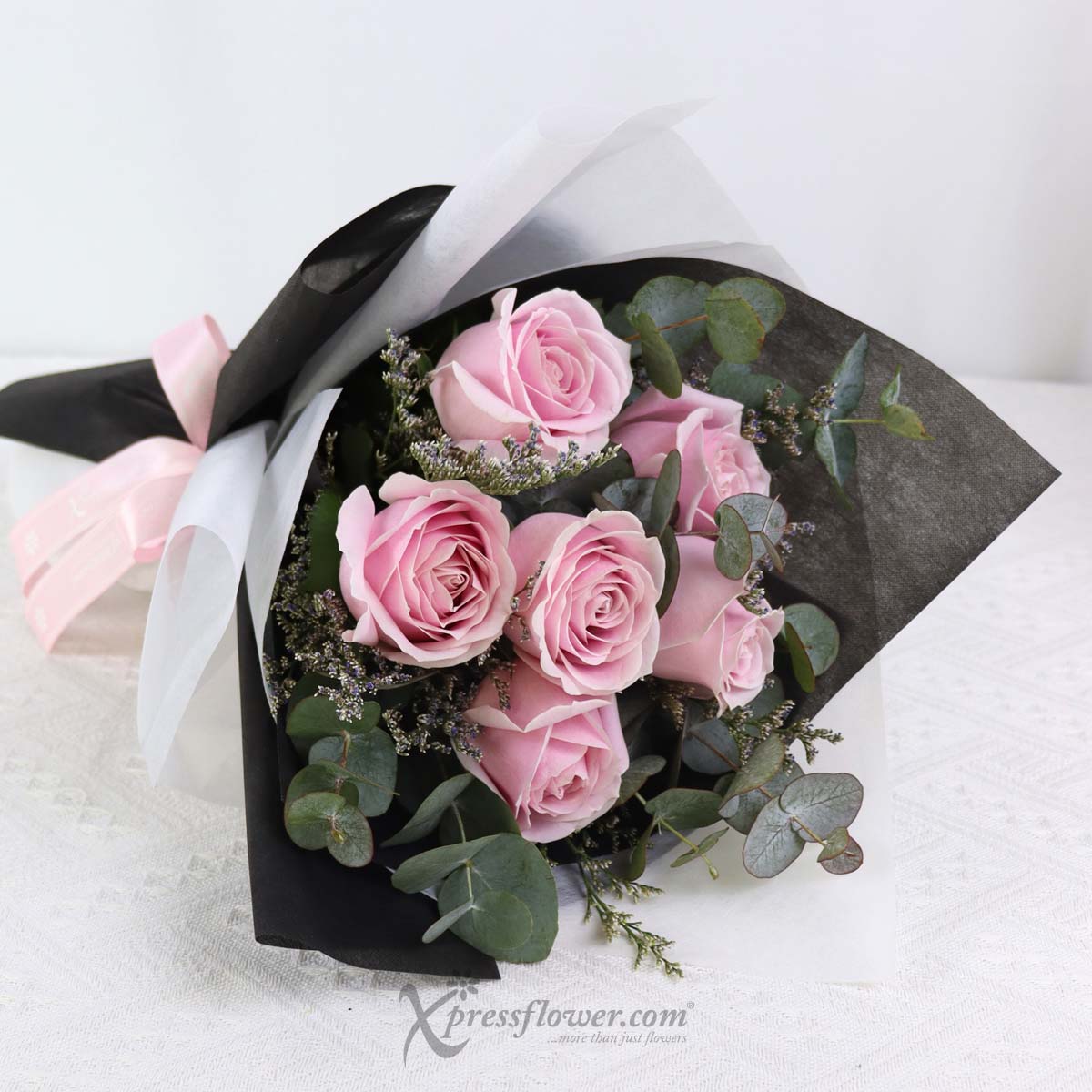 6 stalks pink roses, limonium misty blue, eucalyptus cinerea.