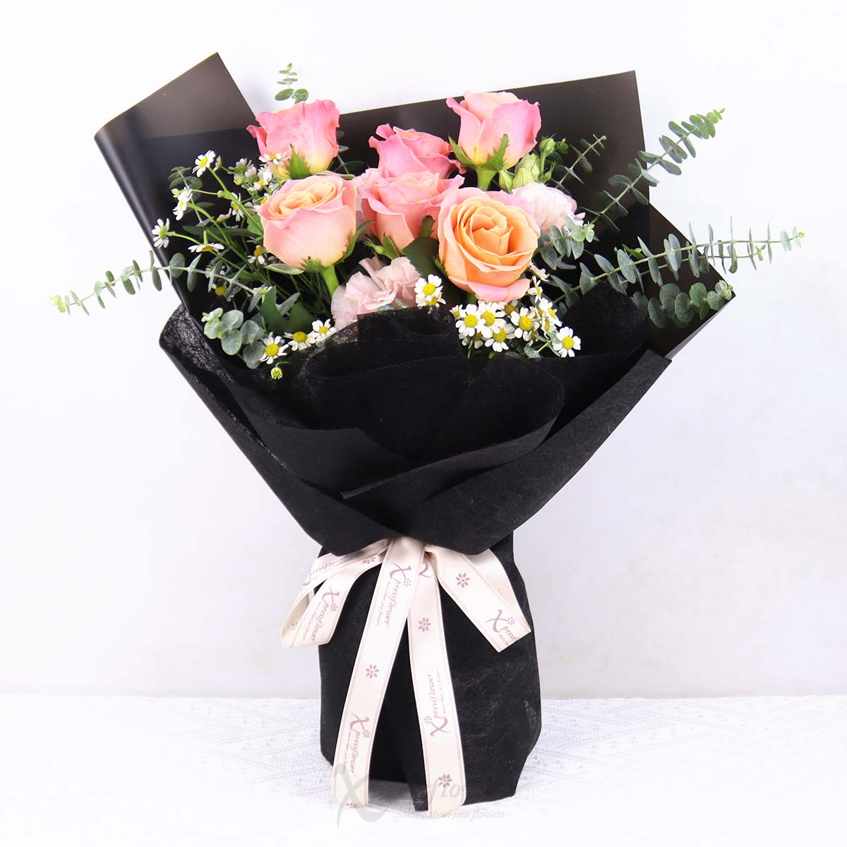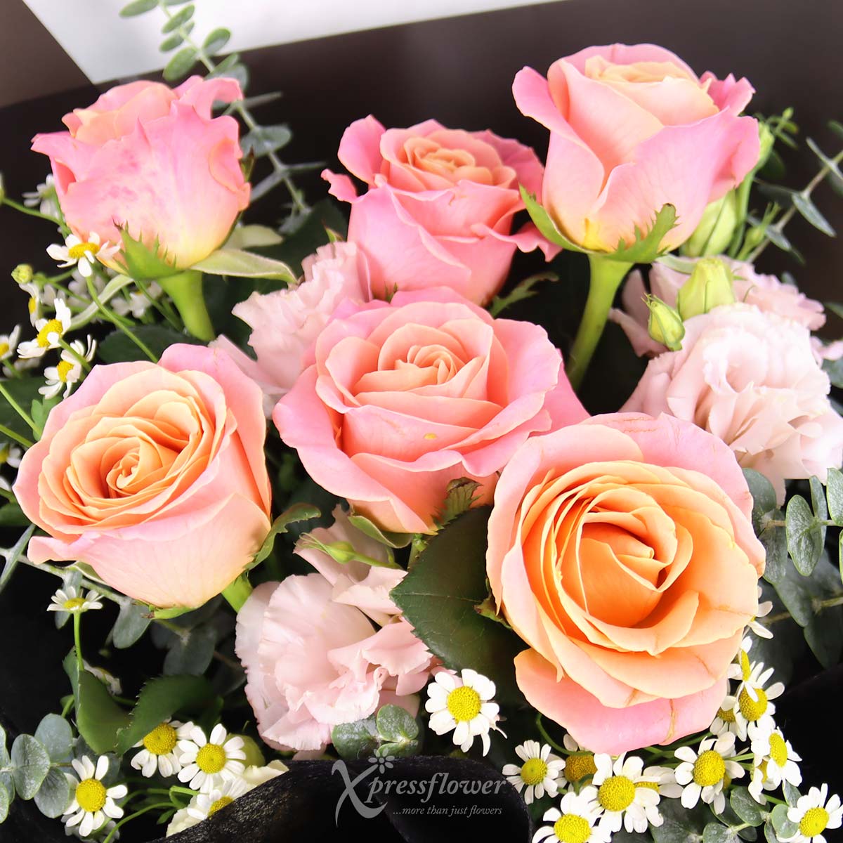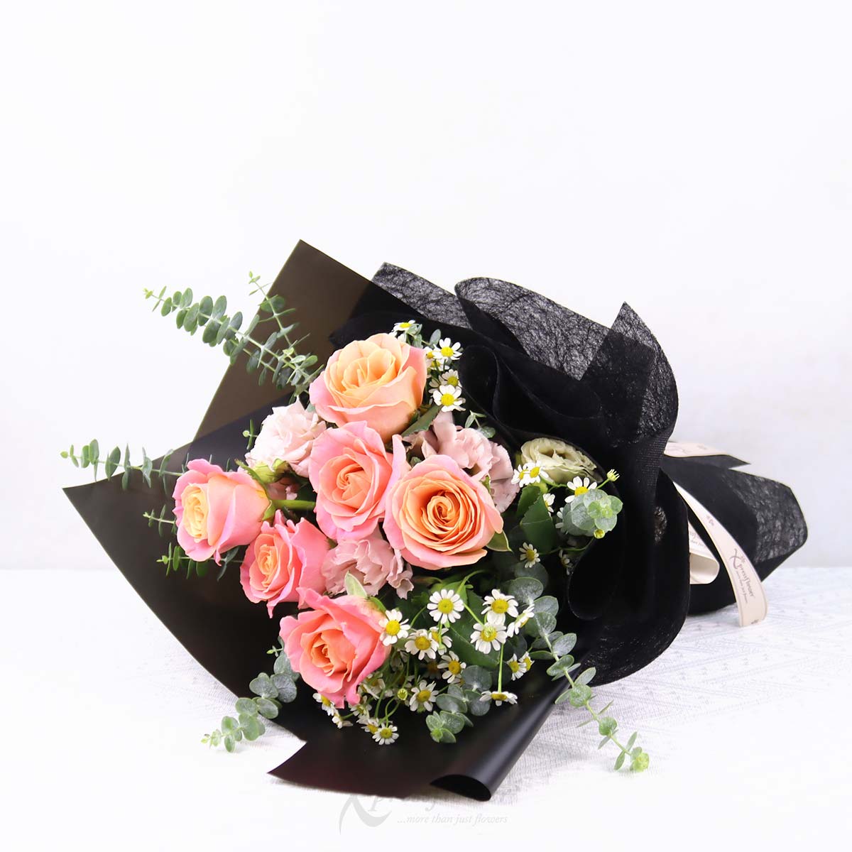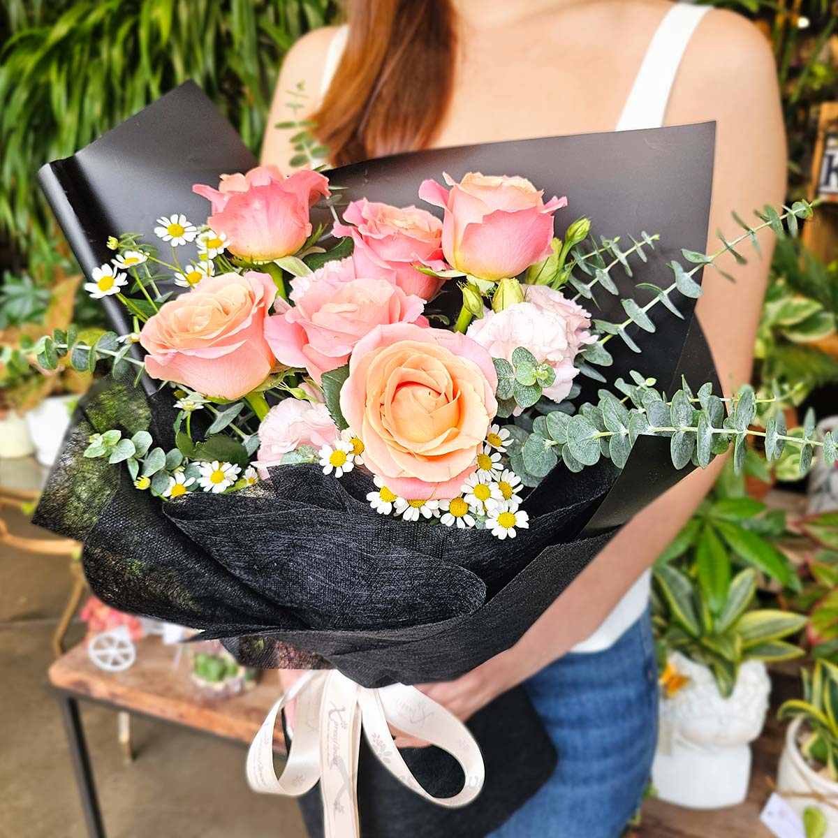 Chic and charming, this fresh flower bouquet of 6 stalks pink piggy roses, apricot eustoma, chamomile, and eucalyptus is wrapped in bold black for that modern edge. A go-to gift for birthdays, appreciation, or “just because” moments, this bouquet is perfect because timeless blooms never go out of style.