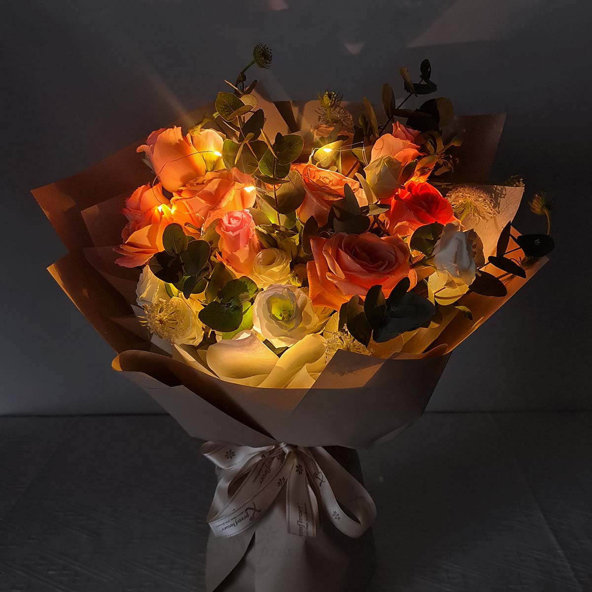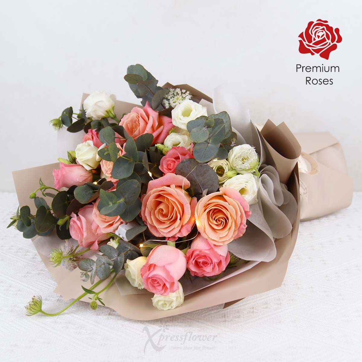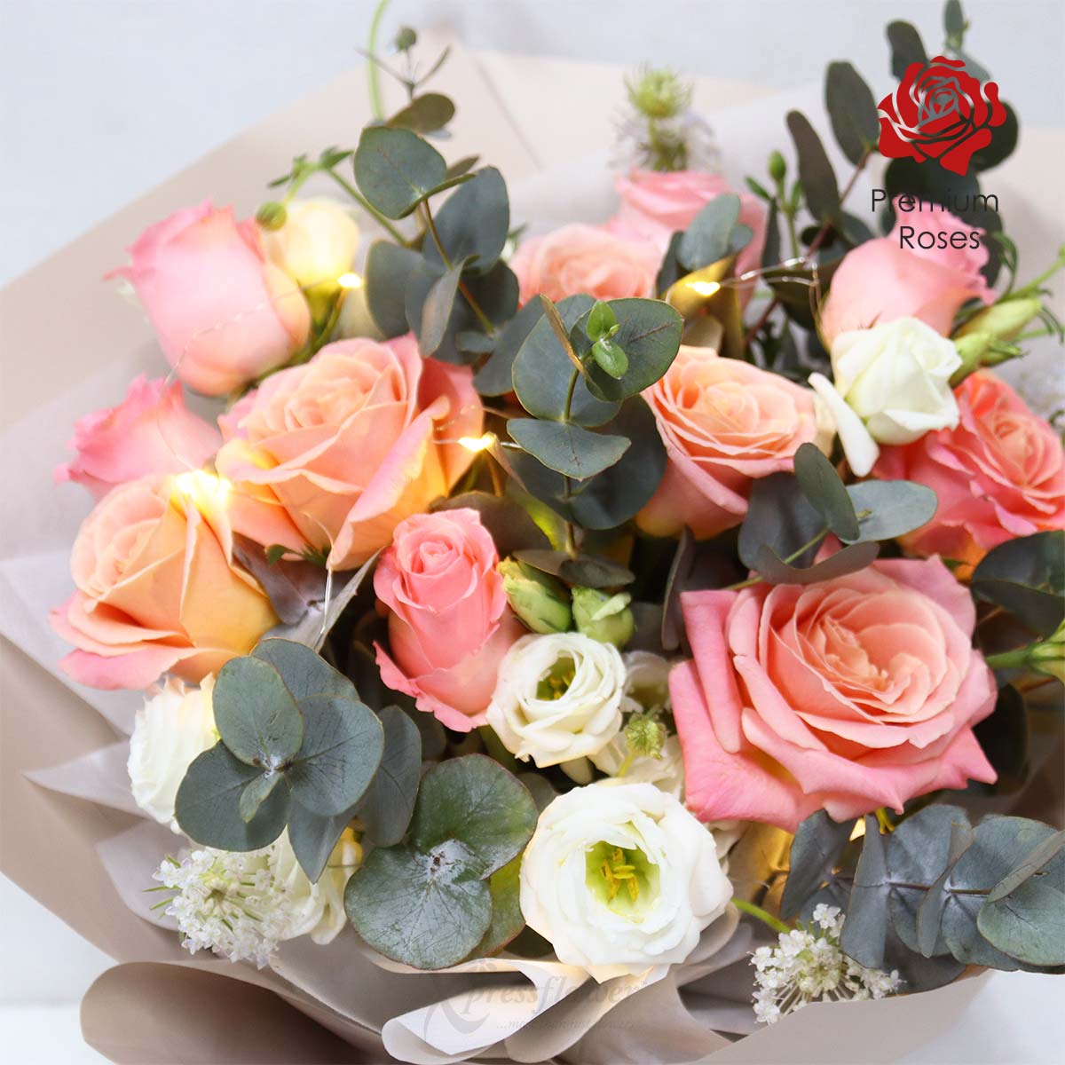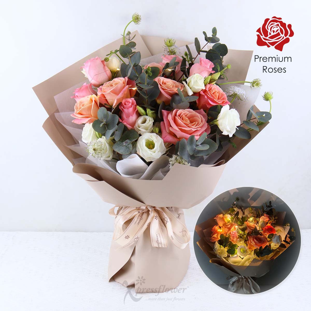 Delight in romance with this fresh flower bouquet of 5 stalks Dianna Sweet Pink roses, 6 Miss Piggy roses, and other acocmpanying blooms. Wrapped in a light brown wrapper with LED lights, this bouquet of 11 roses symbolizes "You are my treasured one," making it an ideal surprise for a romantic occasion.