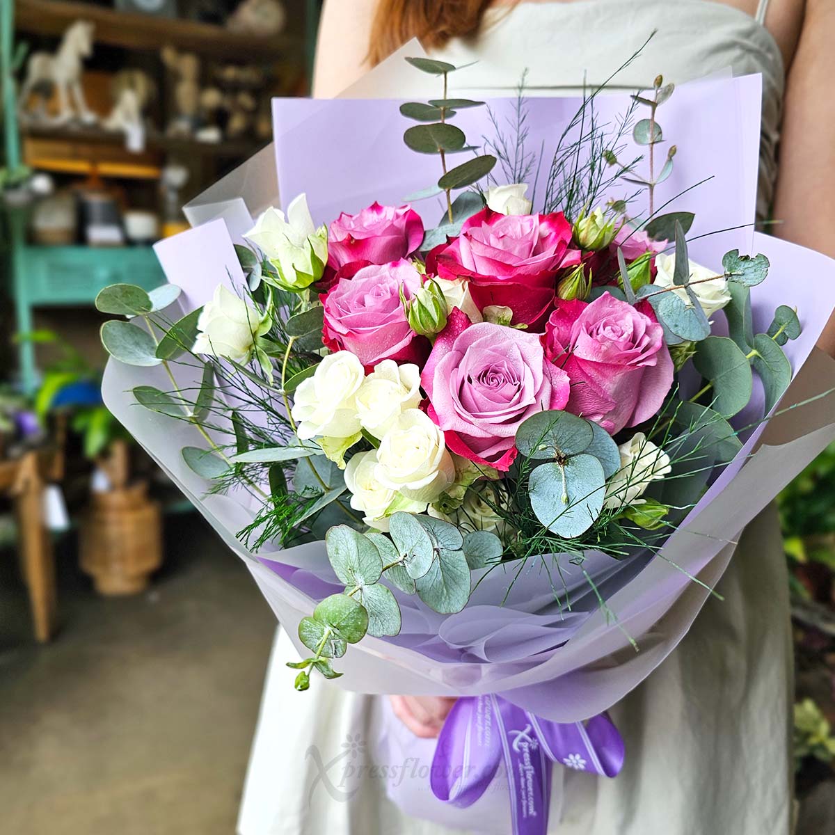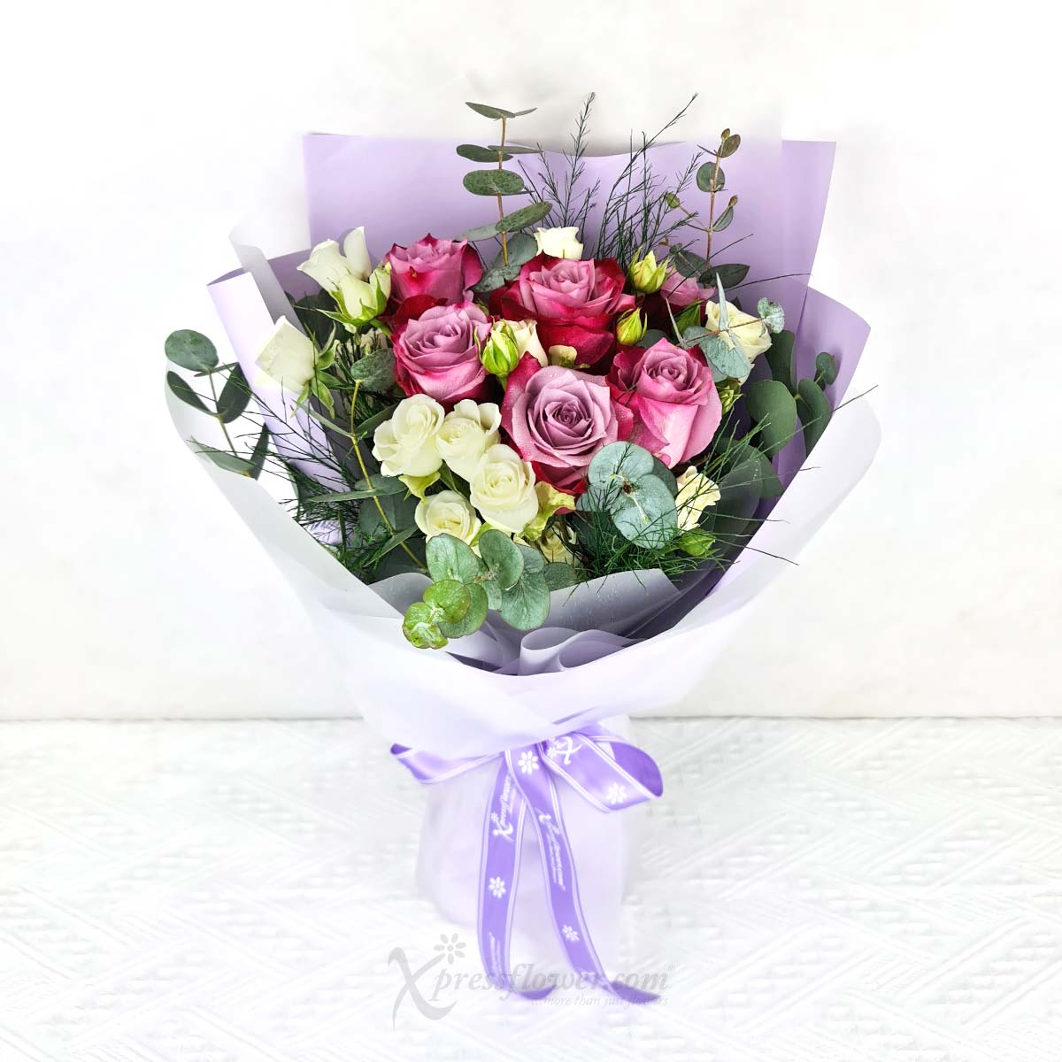 Capture hearts with our fresh rose bouquet of 6 Yam roses, delicate white rose sprays, and alluring accents. Wrapped in a purple wrapper, it signifies fascination and "I want to be yours." Surprise your sweetheart with this mesmerizing declaration of affection.