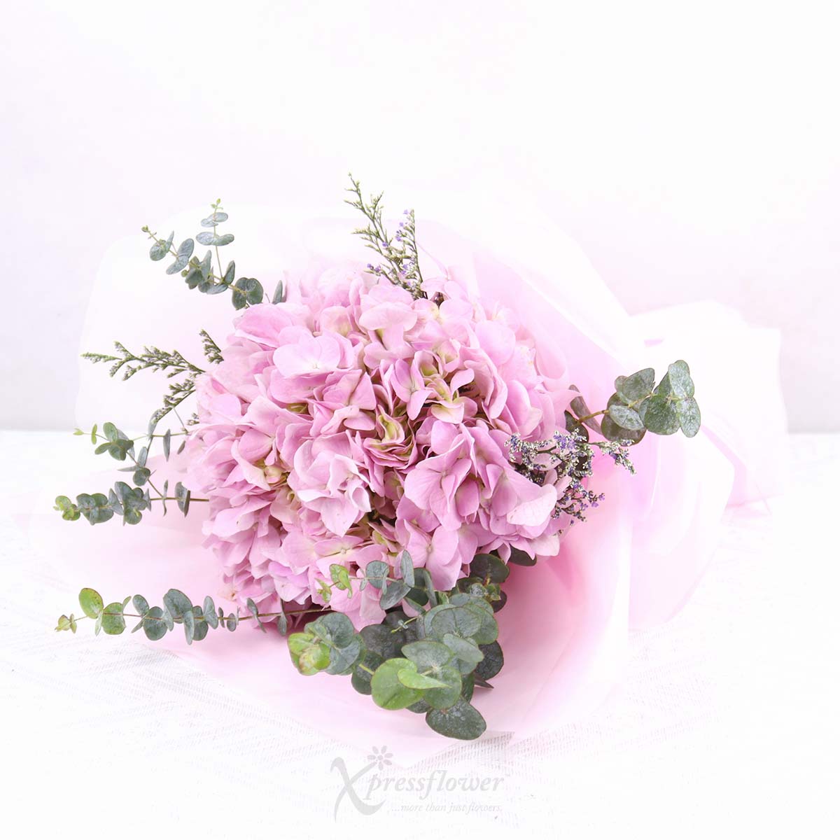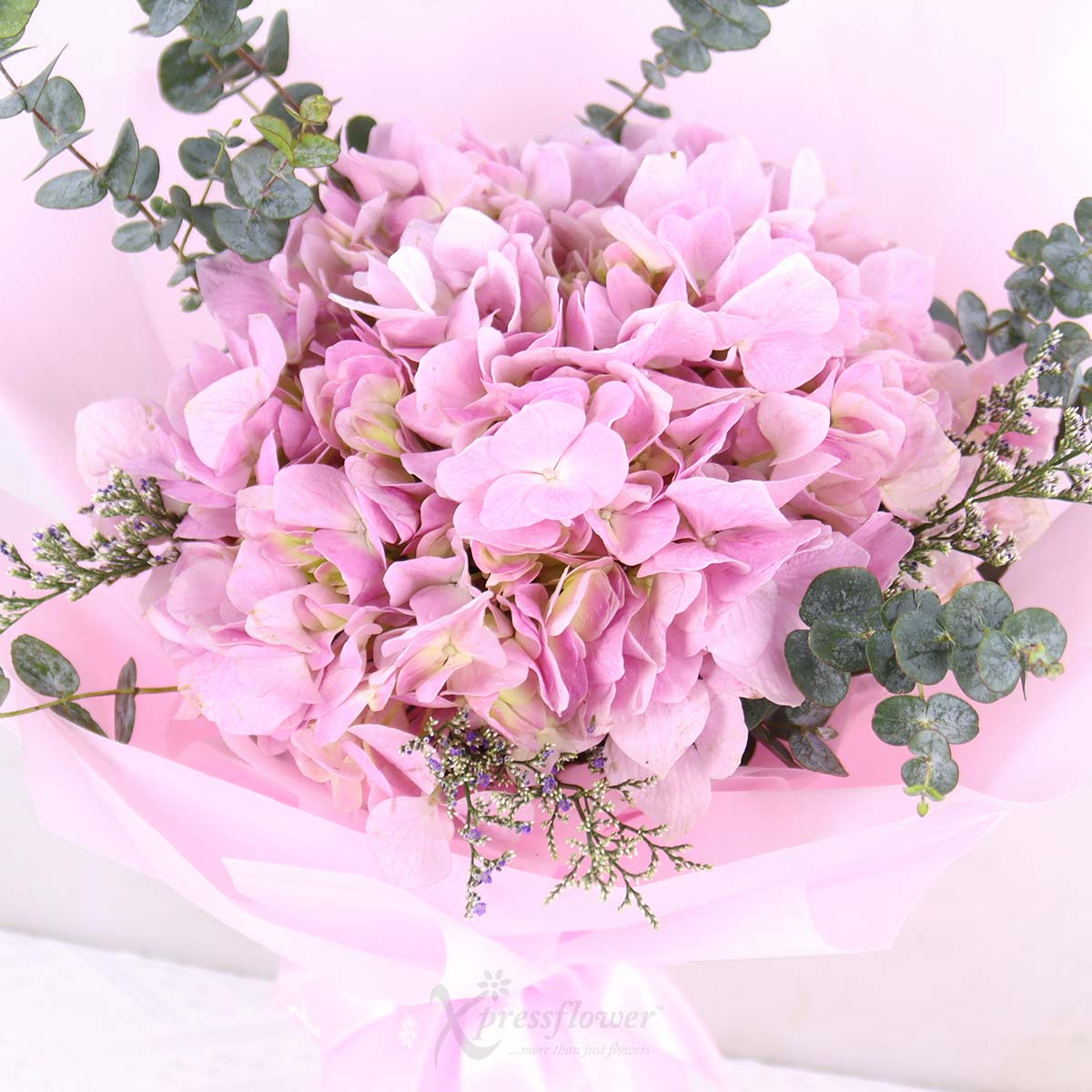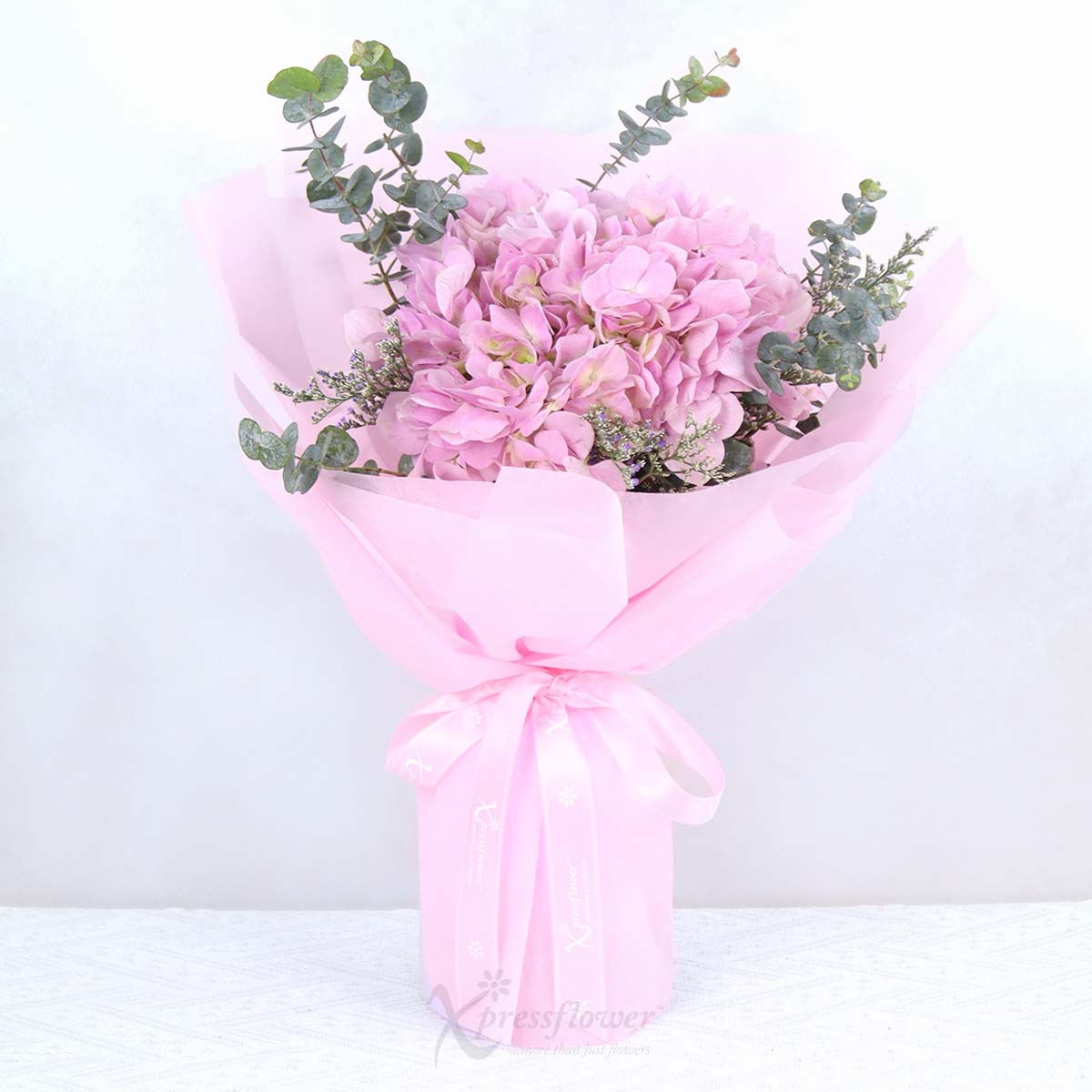 Delicate yet full of meaning, this soft pink hydrangea bouquet is paired with blue misty and eucalyptus for a touch of calm. Wrapped in gentle pink, it’s perfect for expressing love, romance, or simply a heartfelt gesture to someone special.