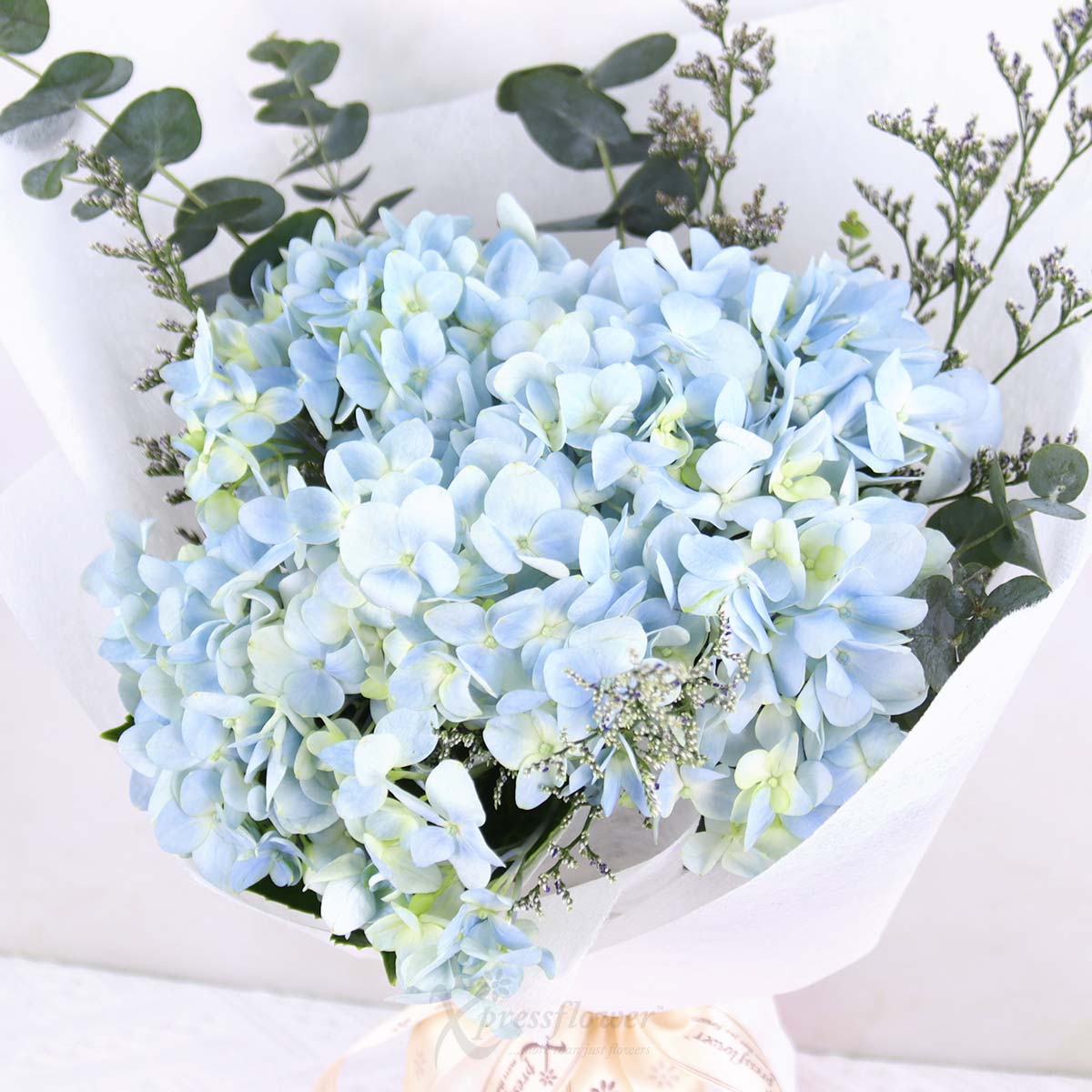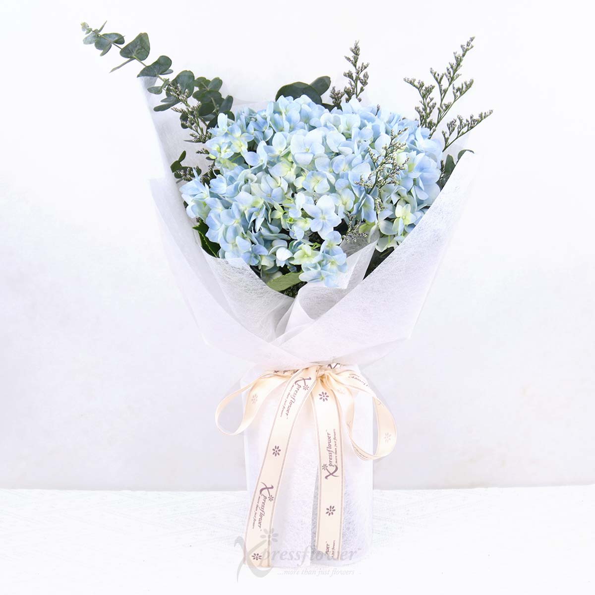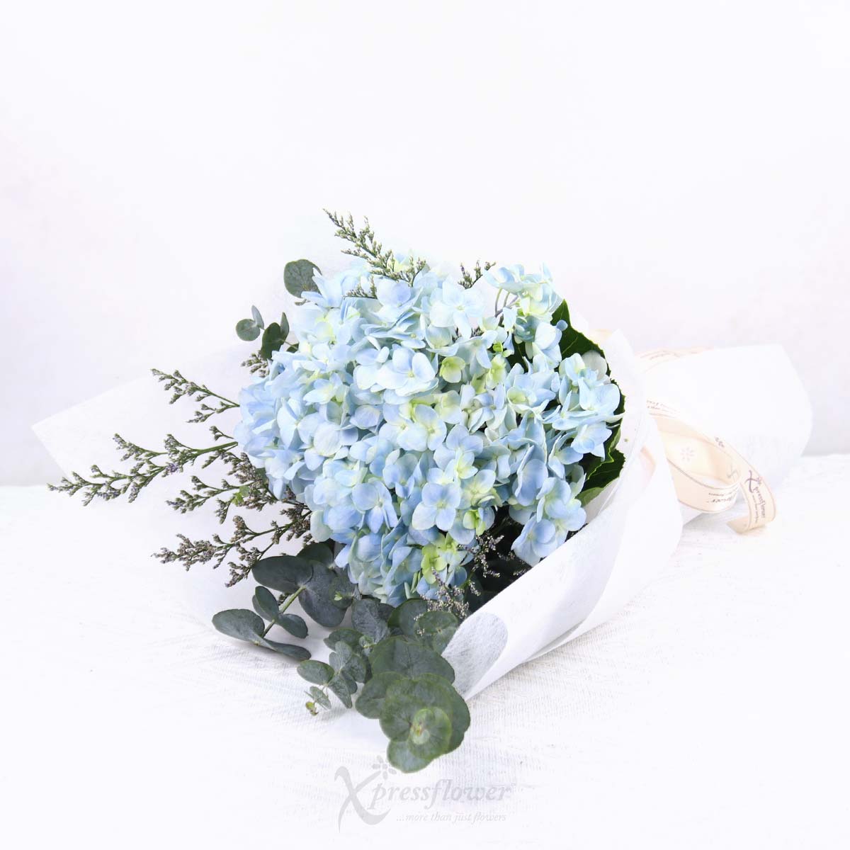 A single blue hydrangea takes center stage in this graceful bouquet, wrapped in white and softened by blue misty and eucalyptus. Ideal for expressing gratitude, sincere apologies, or heartfelt appreciation with elegance and calm.