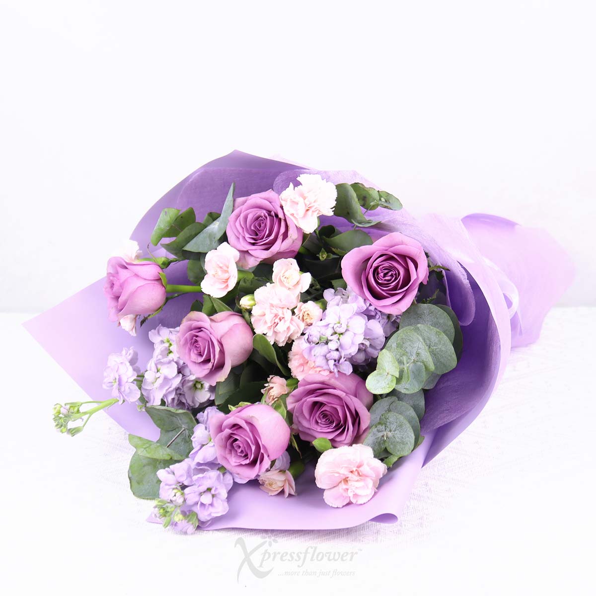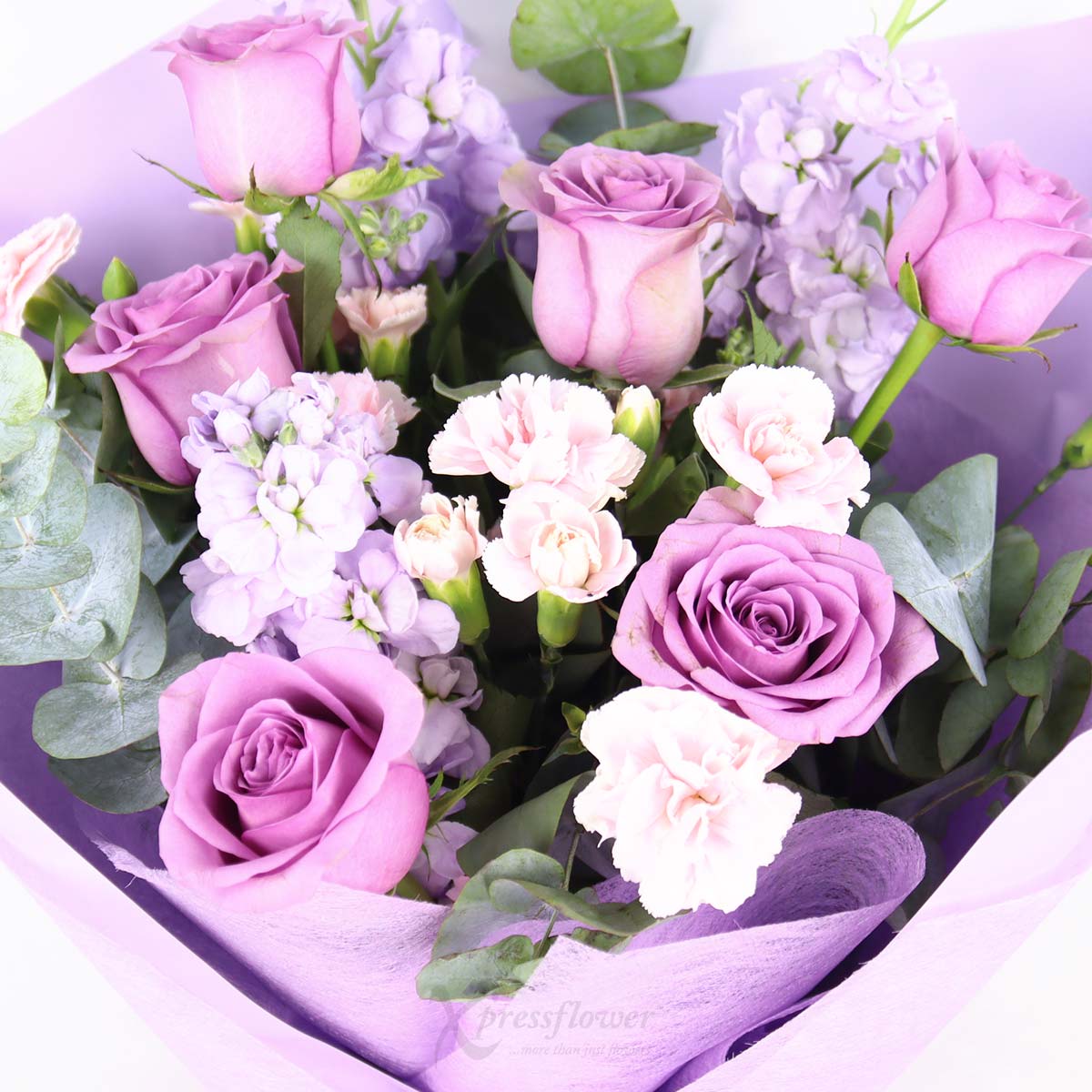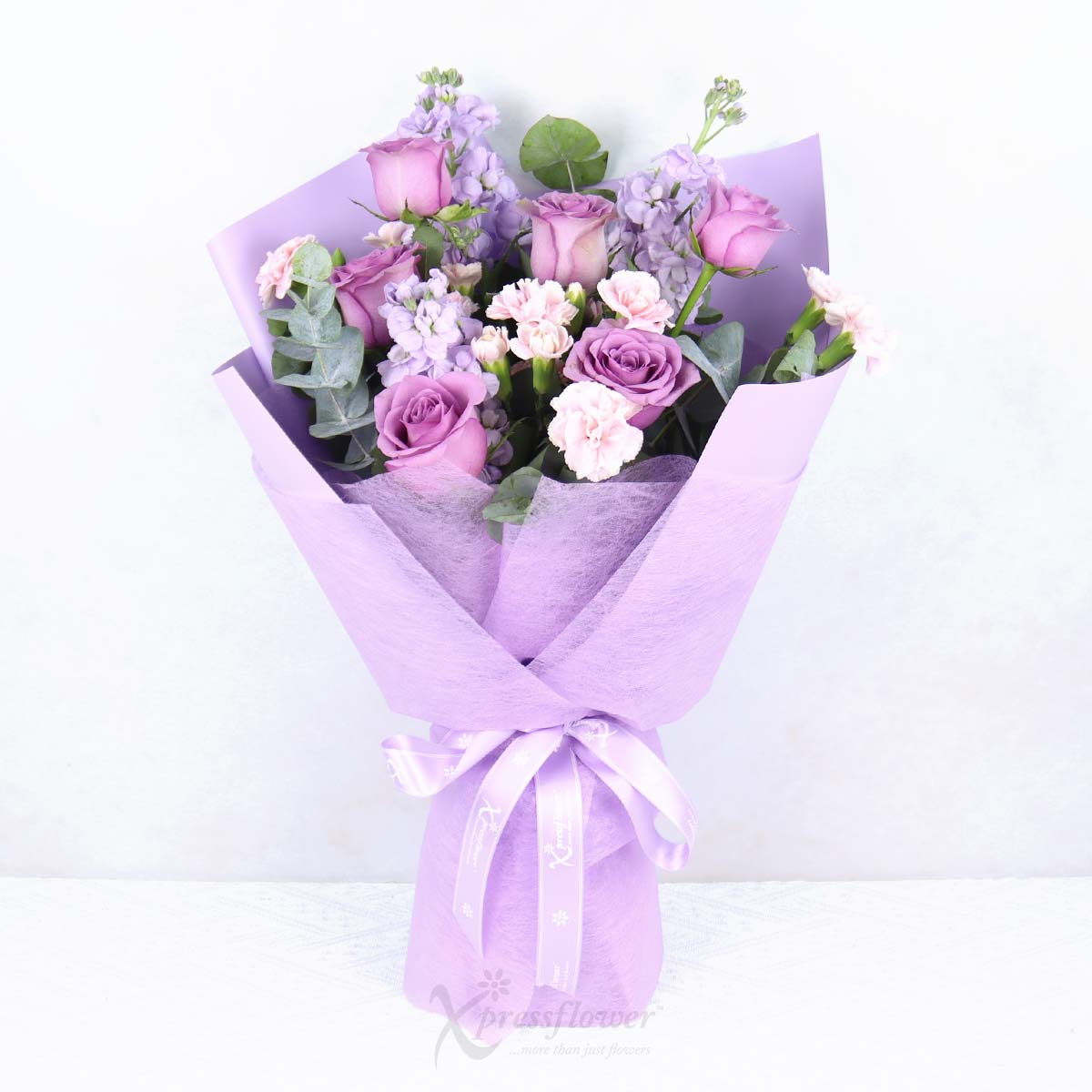 Ethereal and elegant, this fresh flower bouquet features 6 stalks Zixia Fairy roses, pastel carnations, purple matthiola, and eucalyptus cinerea, all wrapped in lavender hues and finished with a satin bow. It’s the perfect pick-me-up or heartfelt gift for any occasion, where a touch of magic and softness says it all.