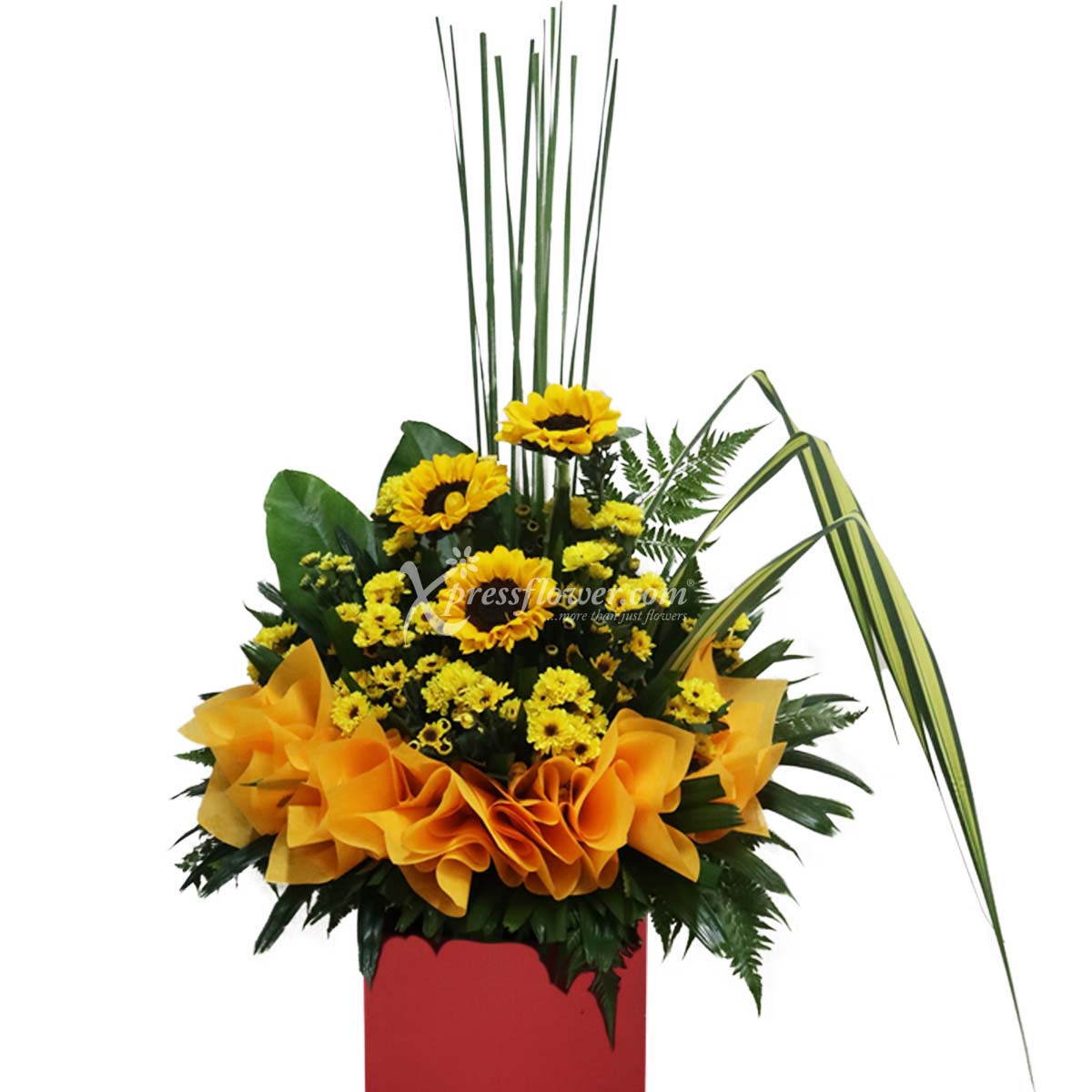 Sunflowers, yellow chrysanthemum spray, typha leaves, pandanus leaves, jungle bush and finger palm, johor fern.