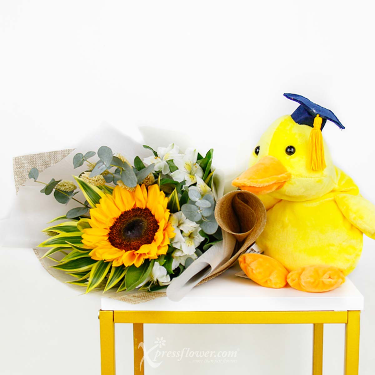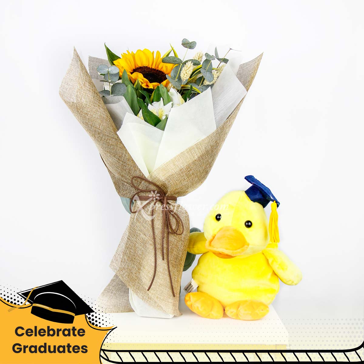 Congrats, Grad! This single stalk sunflower bouquet symbolizes good luck for the future and comes with a graduation duck plushie. Celebrate your graduate and make them happy as a duck with this adorable gift!