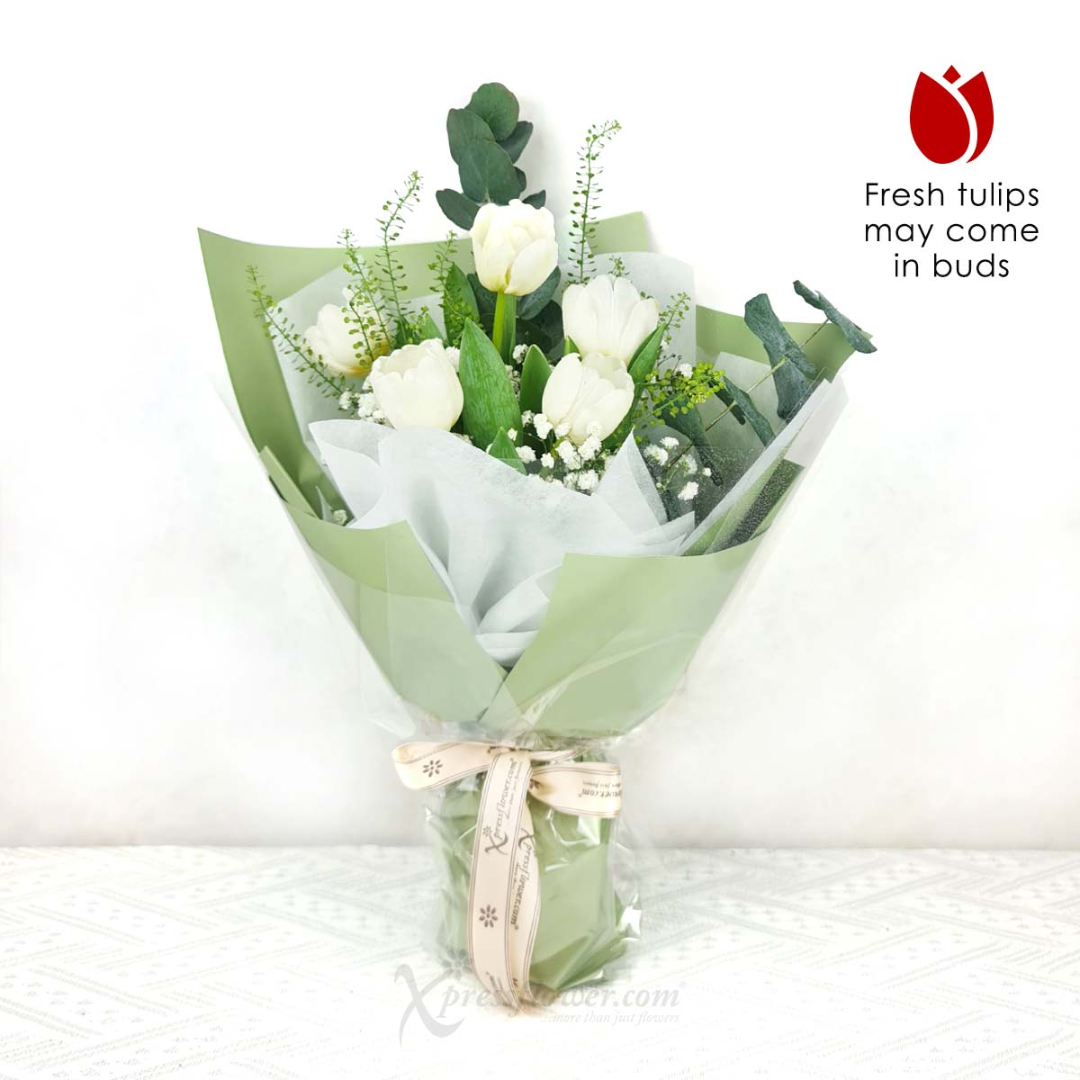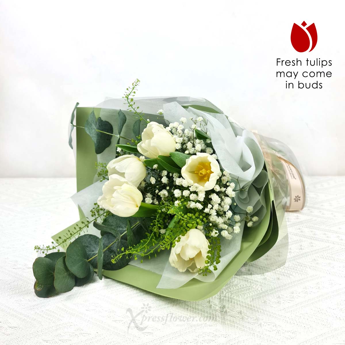 5 stalks of white tulip, Million star, thlaspi green bell and eucalyptus cinerea.