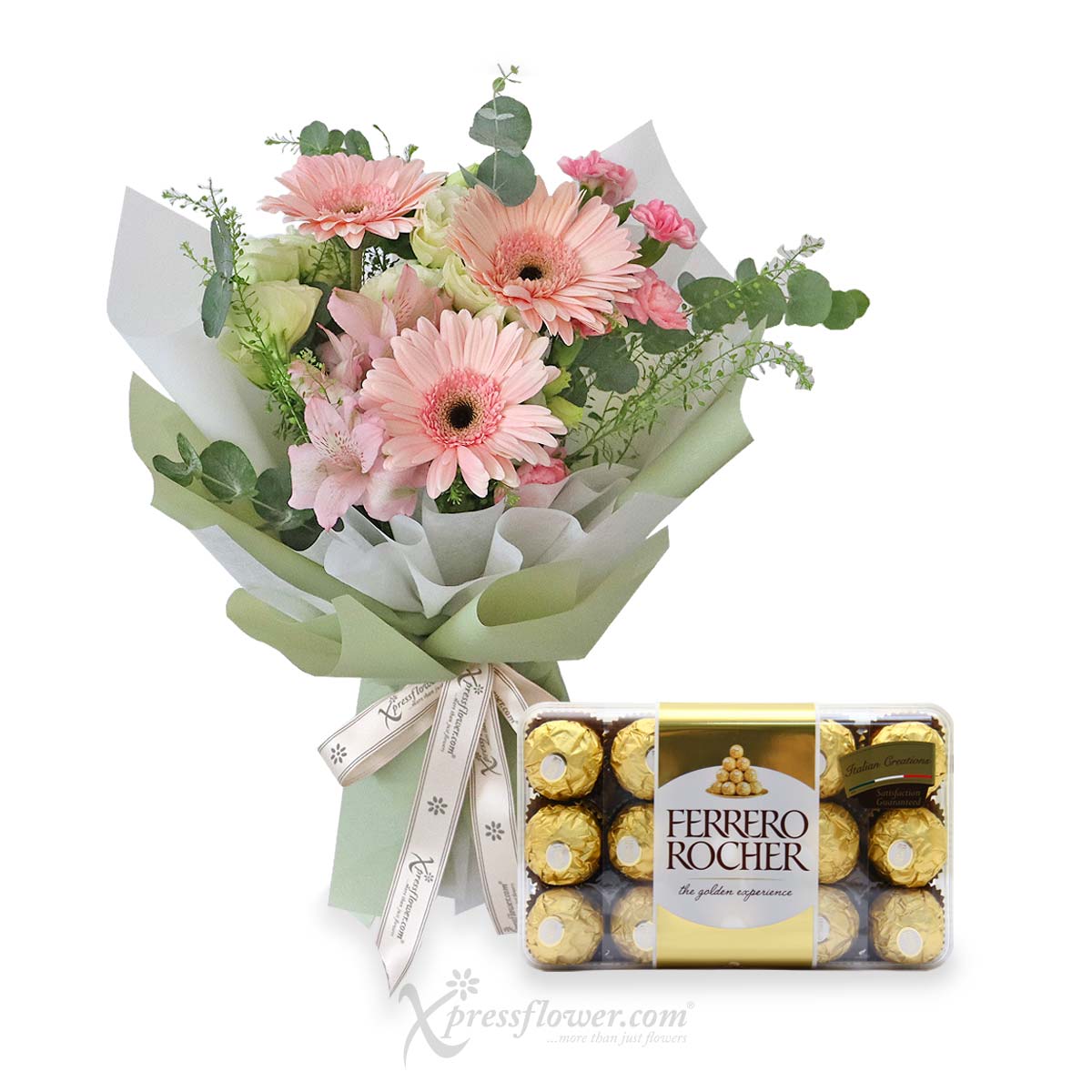 Embrace elegance and sweetness with our romantic fresh flower bouquet. 3 stalks beautiful pink gerberas, symbolizing grace and gentility, paired with a box of Ferrero Rocher chocolates, make the perfect surprise for your sweetheart's sweet tooth!