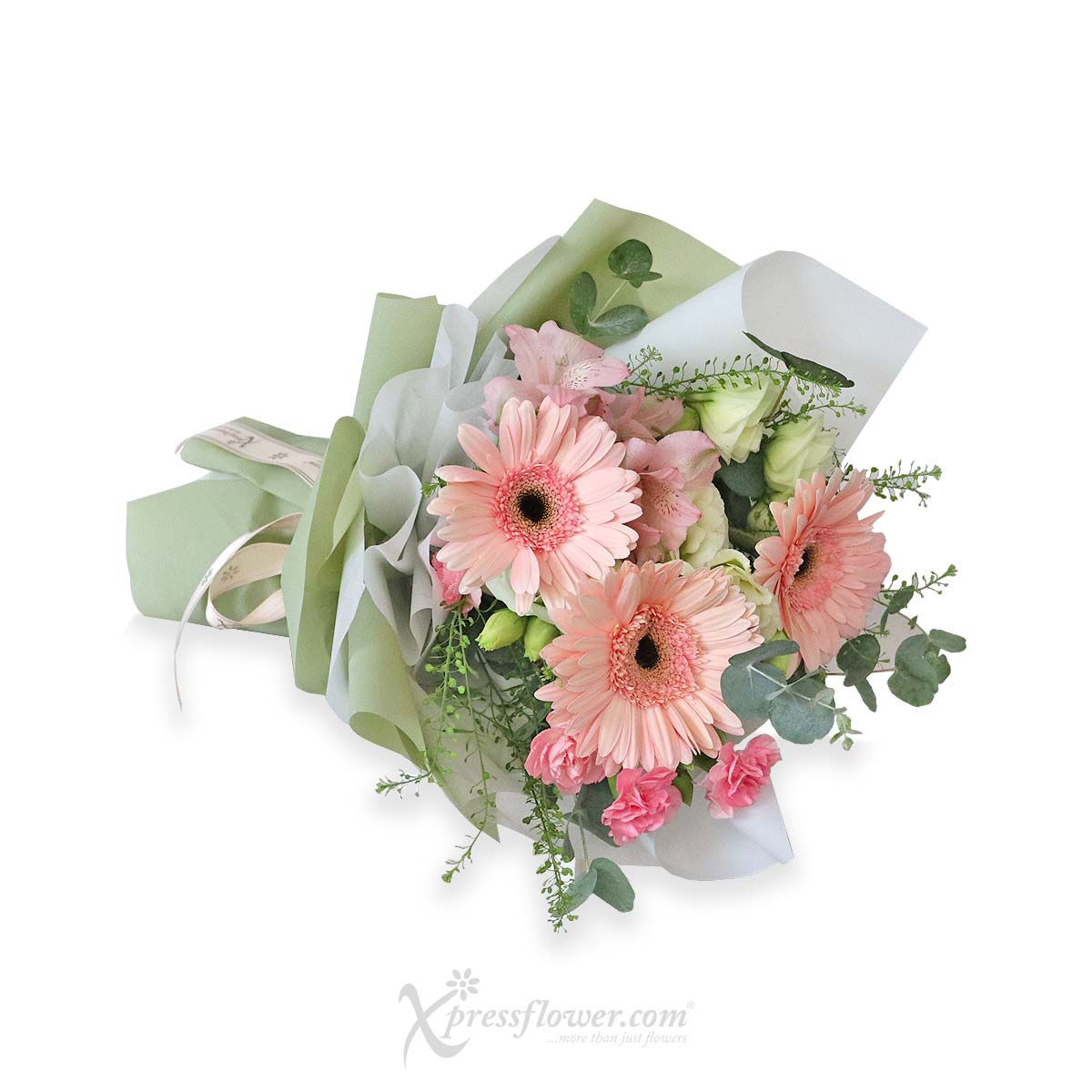 3 stalks pink gerbera, pink alstroemeria, green eustoma, pink carnation spray, Thlaspi green bell, eucalyptus cinerea.