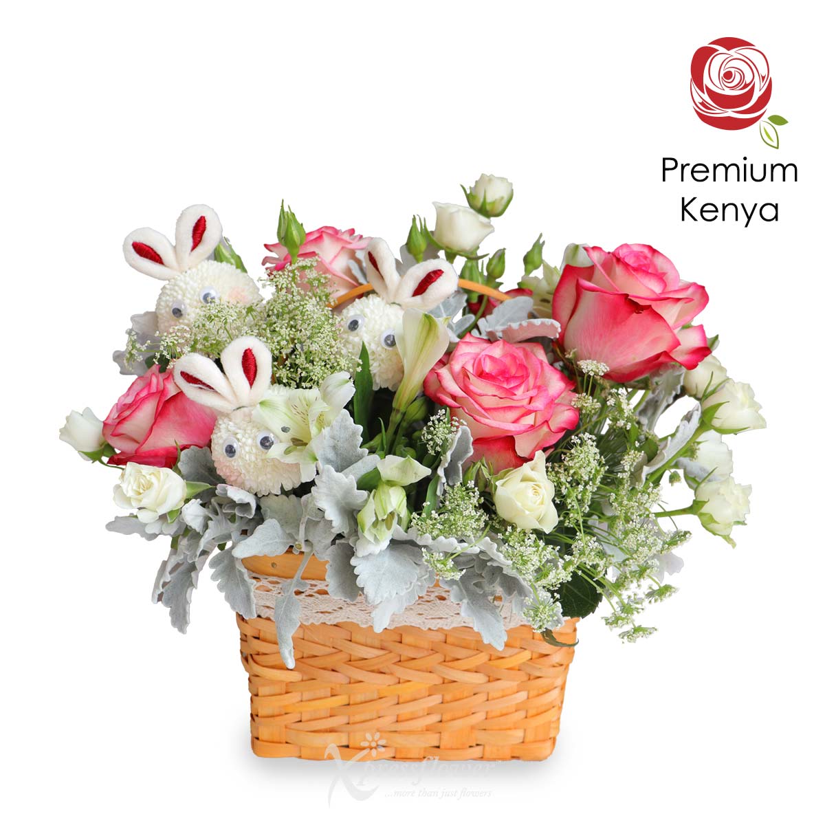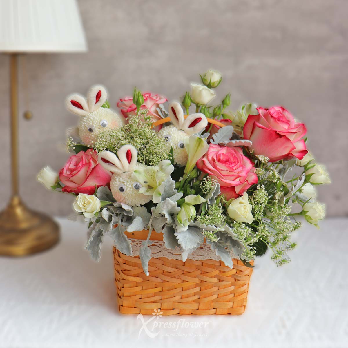 Send some cute love with this Fresh Flower Basket Arrangement. Adorable 2-toned pink roses, delicate white ping pong with bunny ears, white rose sprays, and more, are beautifully arranged in a rectangle willow basket. Send a cute surprise to your loved one for any occasion!