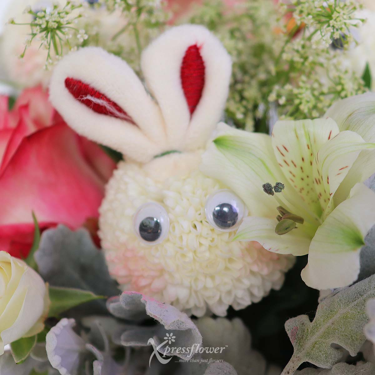 5 stalks two-tone pink roses, white rose spray, white alstroemeria, ammi majus, silver leaves, 3 stalks white ping pong deco with rabbit ears & eyes.