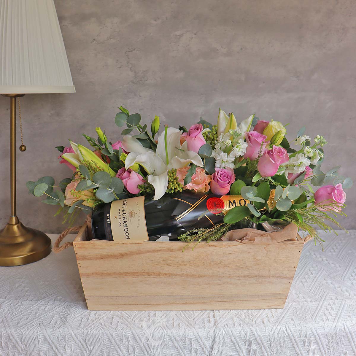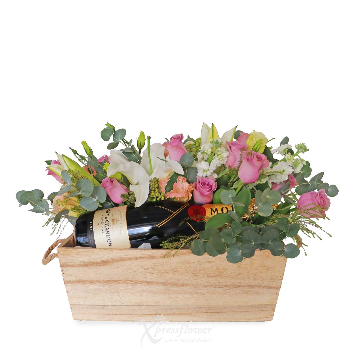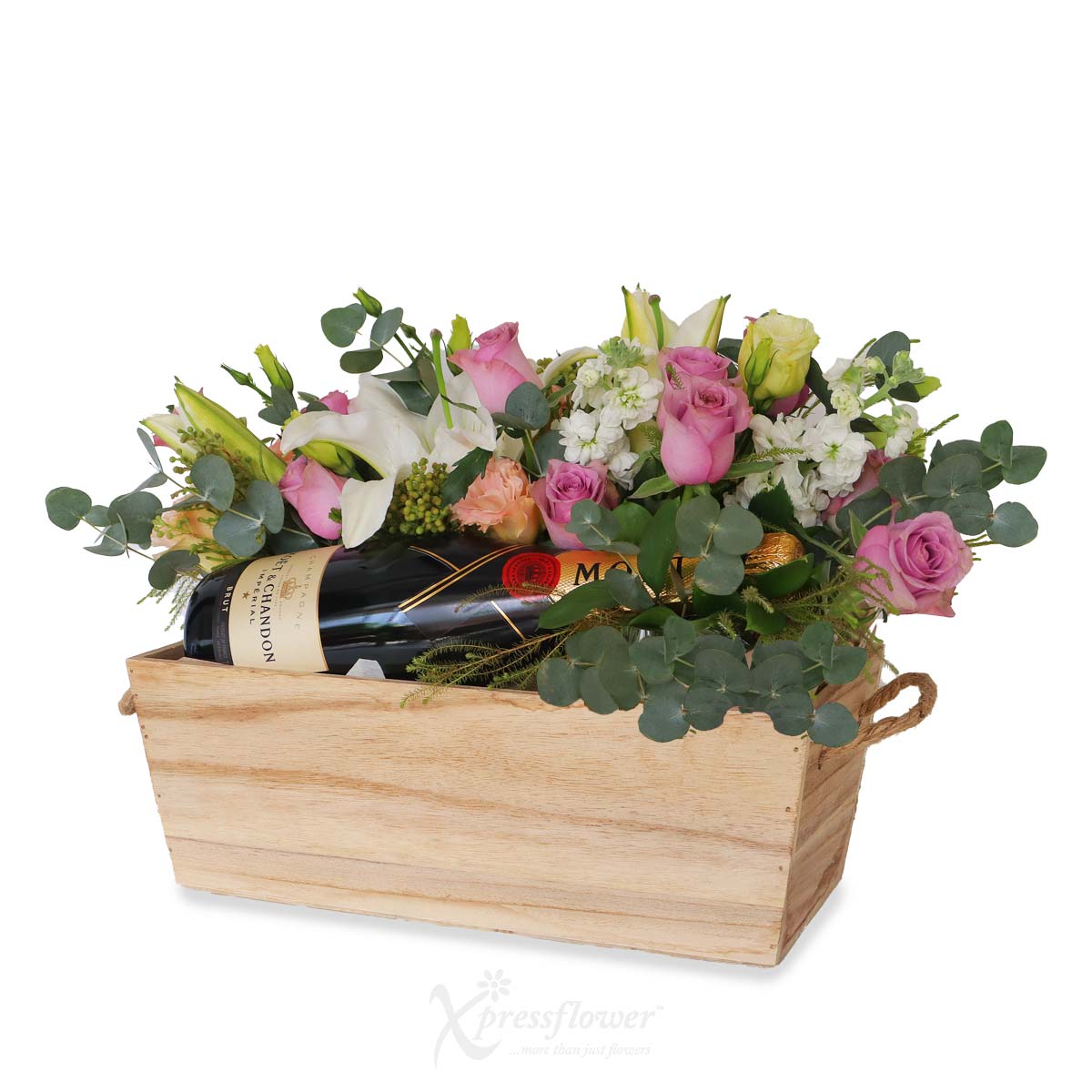 Unleash a wave of delight with our flowers & wine bundle! 11 stalks radiant yam roses, white lily sprays and more, are thoughtfully presented in a wooden basket tray, and accompanied by a bottle of premium Imperial Champagne. Surprise someone special today with this perfect blend of beauty and taste.