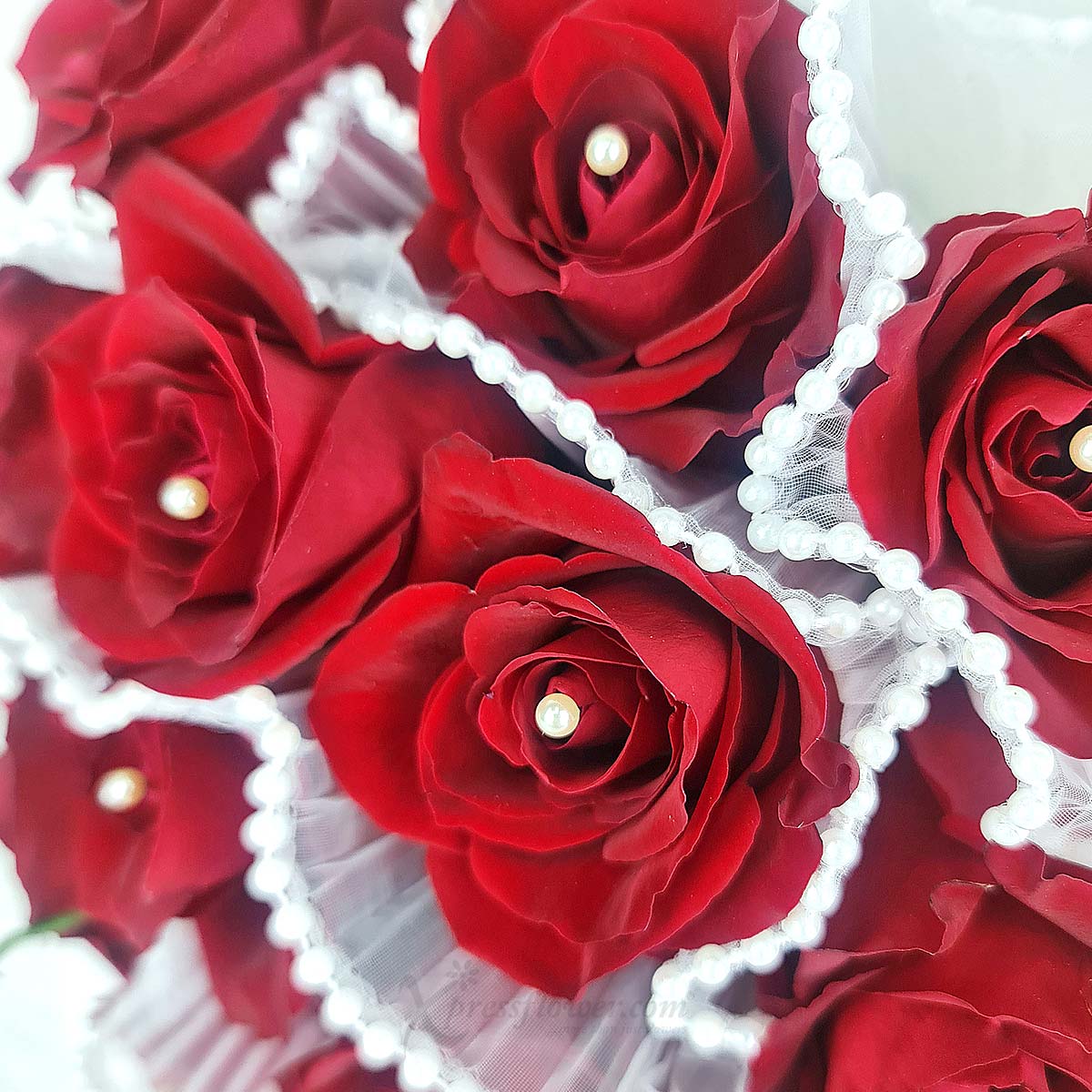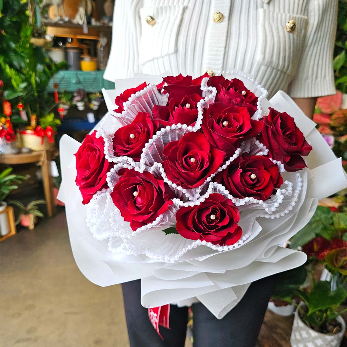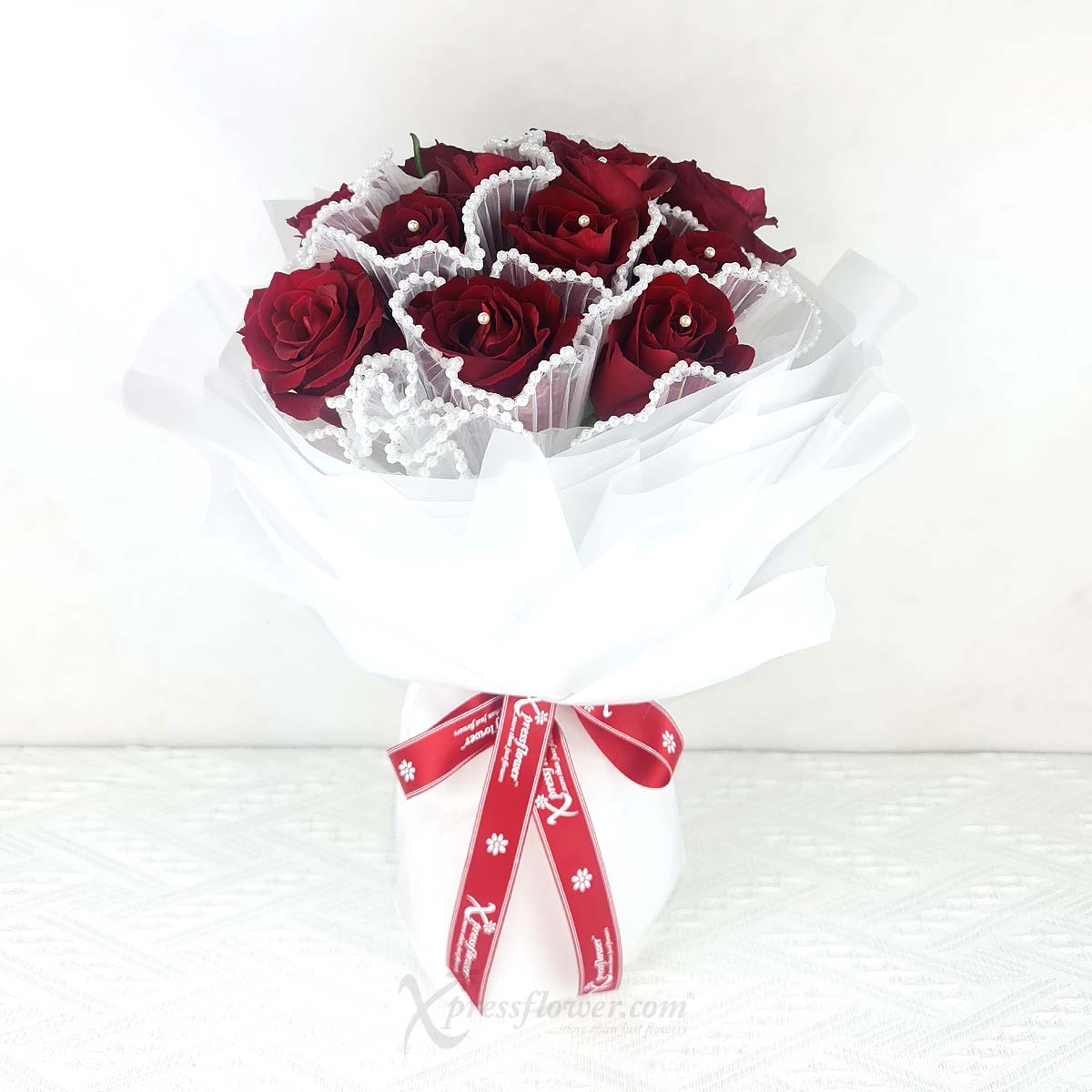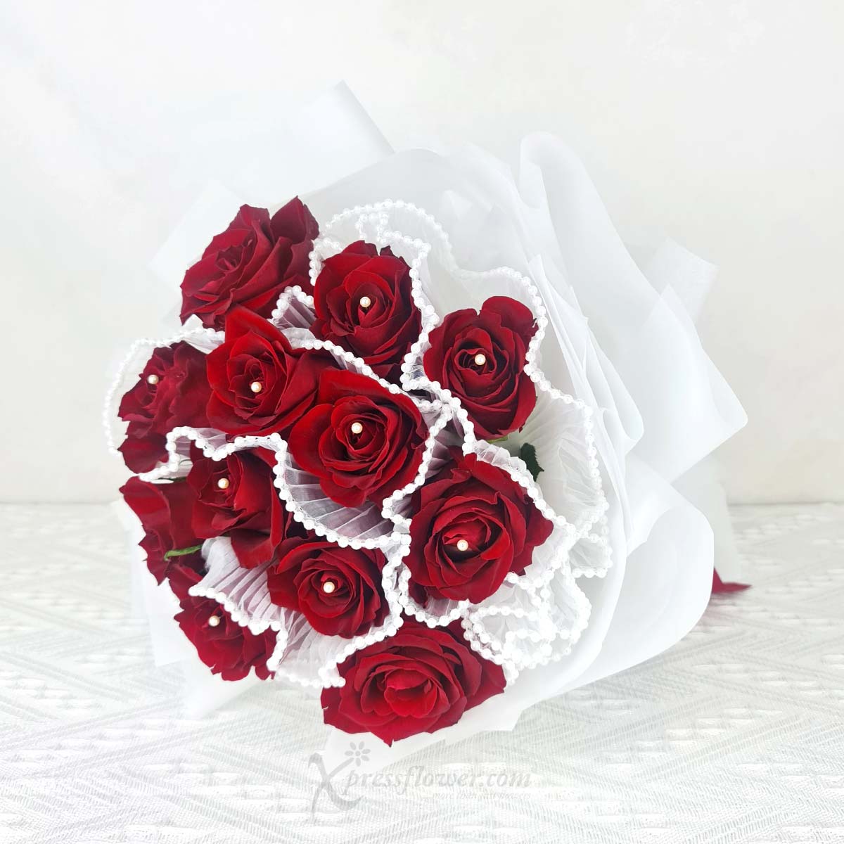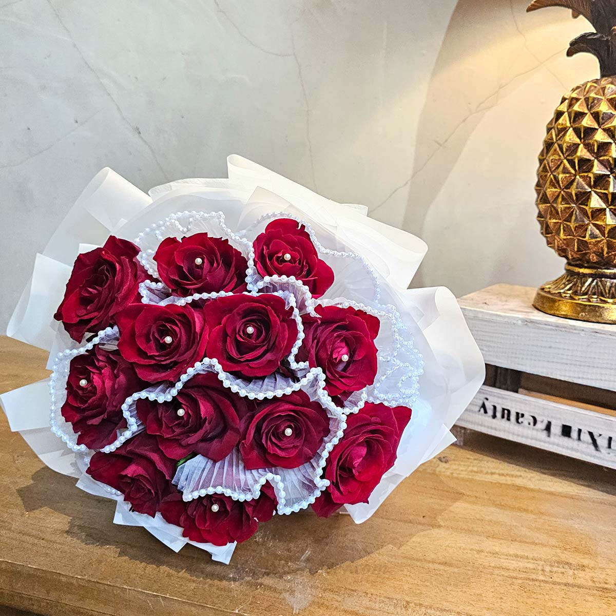 Unveil romance with our elegant rose bouquet – 12 exquisite red roses, adorned with 9 pearl pins, embraced in a white frosty wrapper. Signifying completeness and perfection, it's the ideal surprise to captivate and delight your sweetheart.