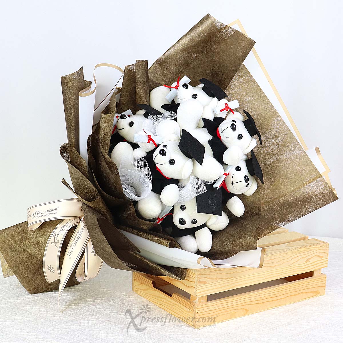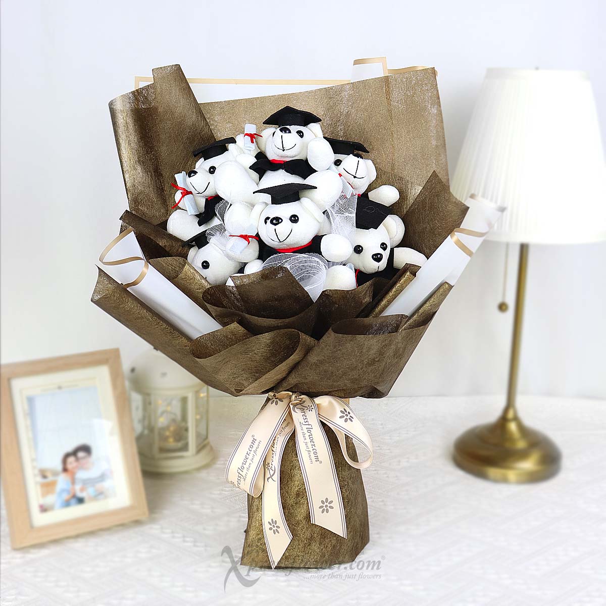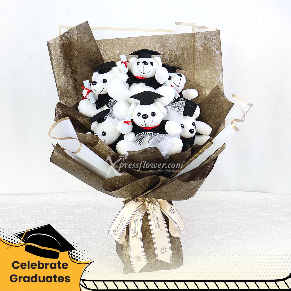 Congratulate your graduate with this unique graduation bouquet! This 6-piece set of white graduation bears with diplomas and mortar boards is sure to bring a smile to their face - and yours! Beautifully wrapped, these cuddlies are the perfect way to celebrate their hard-earned achievements, so send love and congratulate the graduates in your life now!