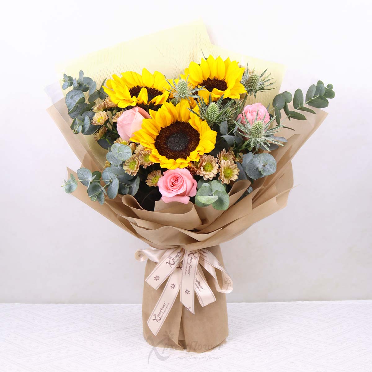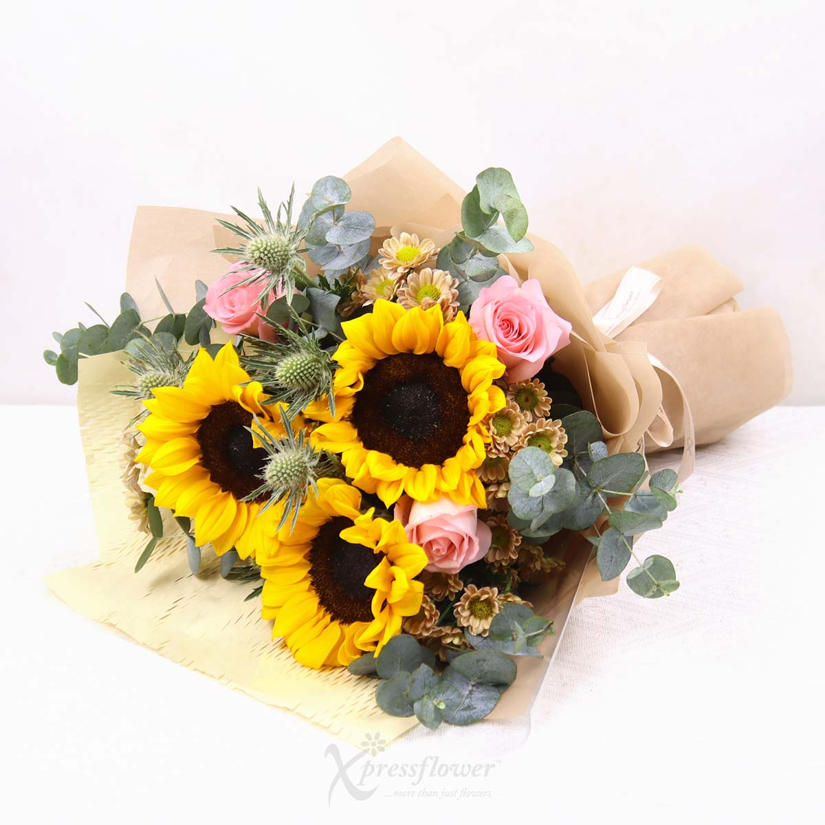 Brighten someone's day with this stunning fresh flower bouquet of 3 stalks sunflowers, 3 stalks Dinna sweet pink roses, and other elegant accompanying blooms. Wrapped in a brown honeycomb mesh with a cream satin ribbon, it beautifully symbolizes pure love and devotion.