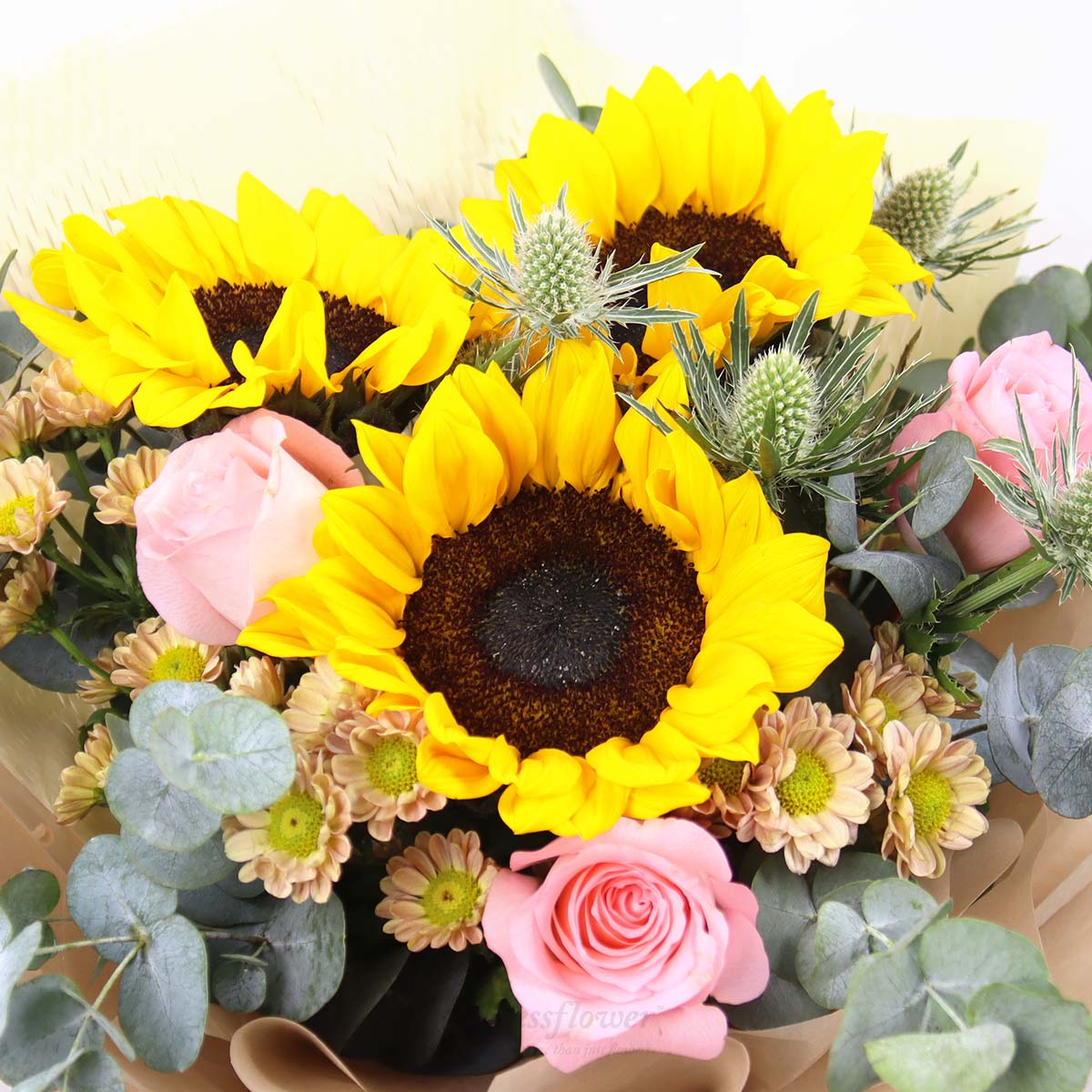 3 stalks of sunflowers, 3 stalks of sweet pink rose, ergnyium white, Mini Pom Pom Rossi Smokey and eucalyptus cinerea.