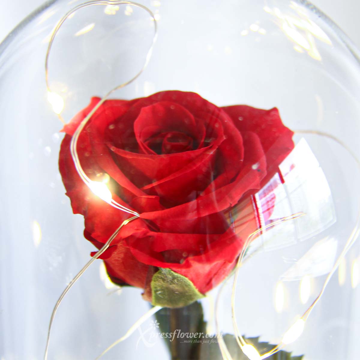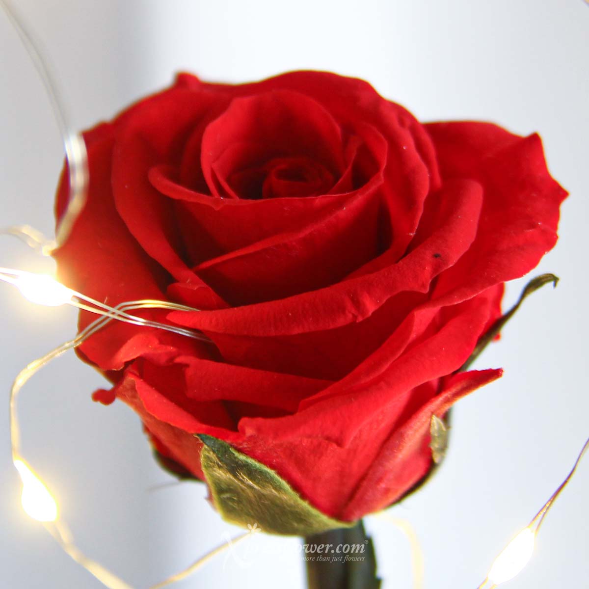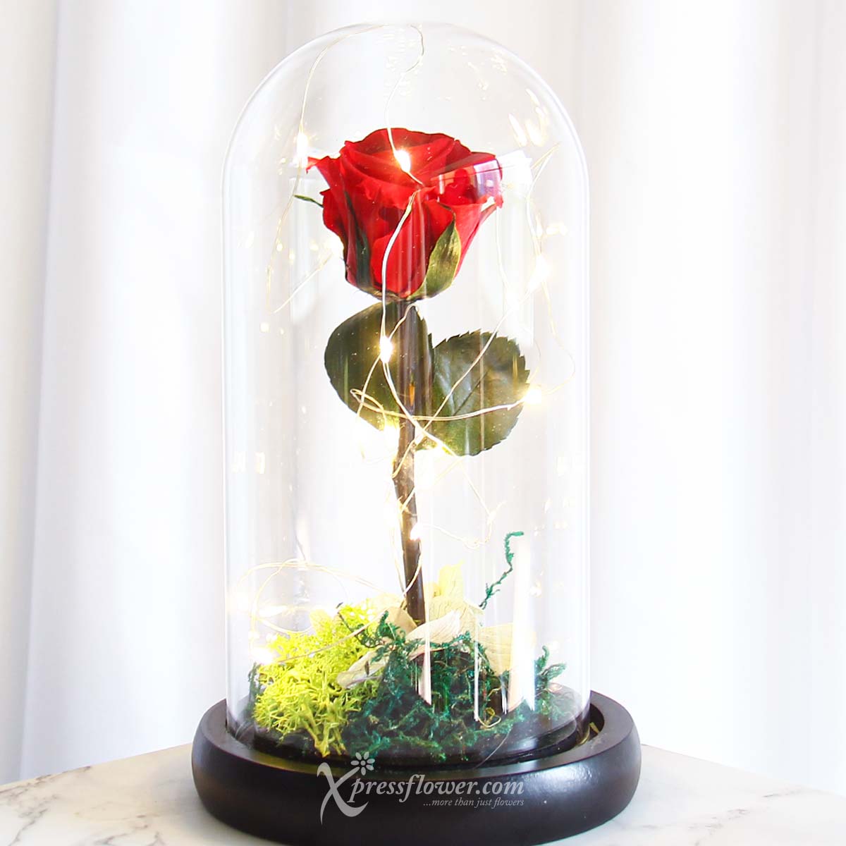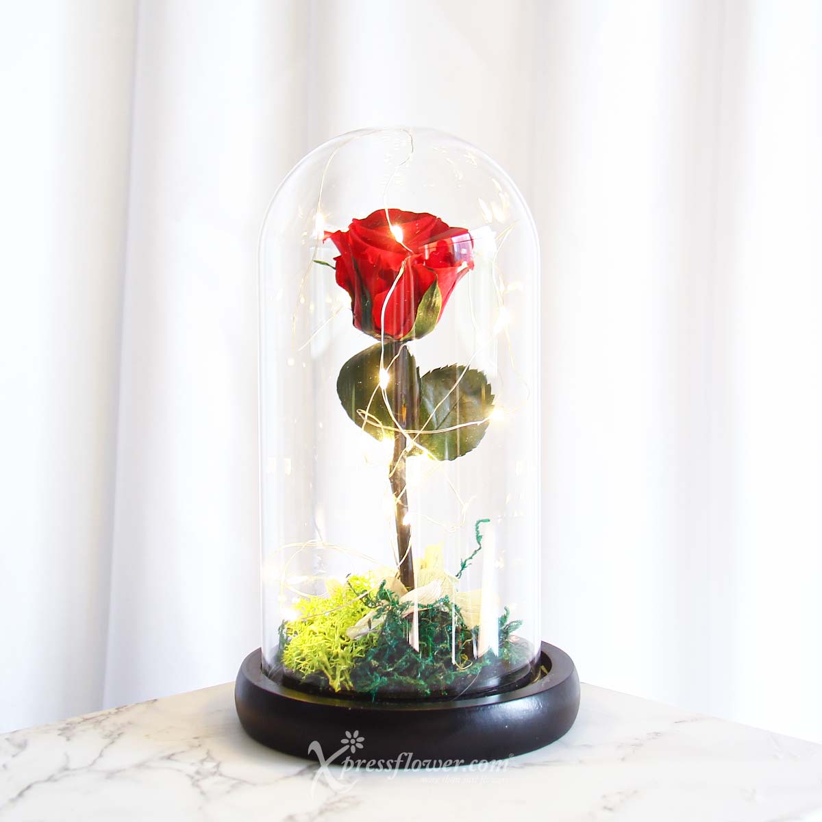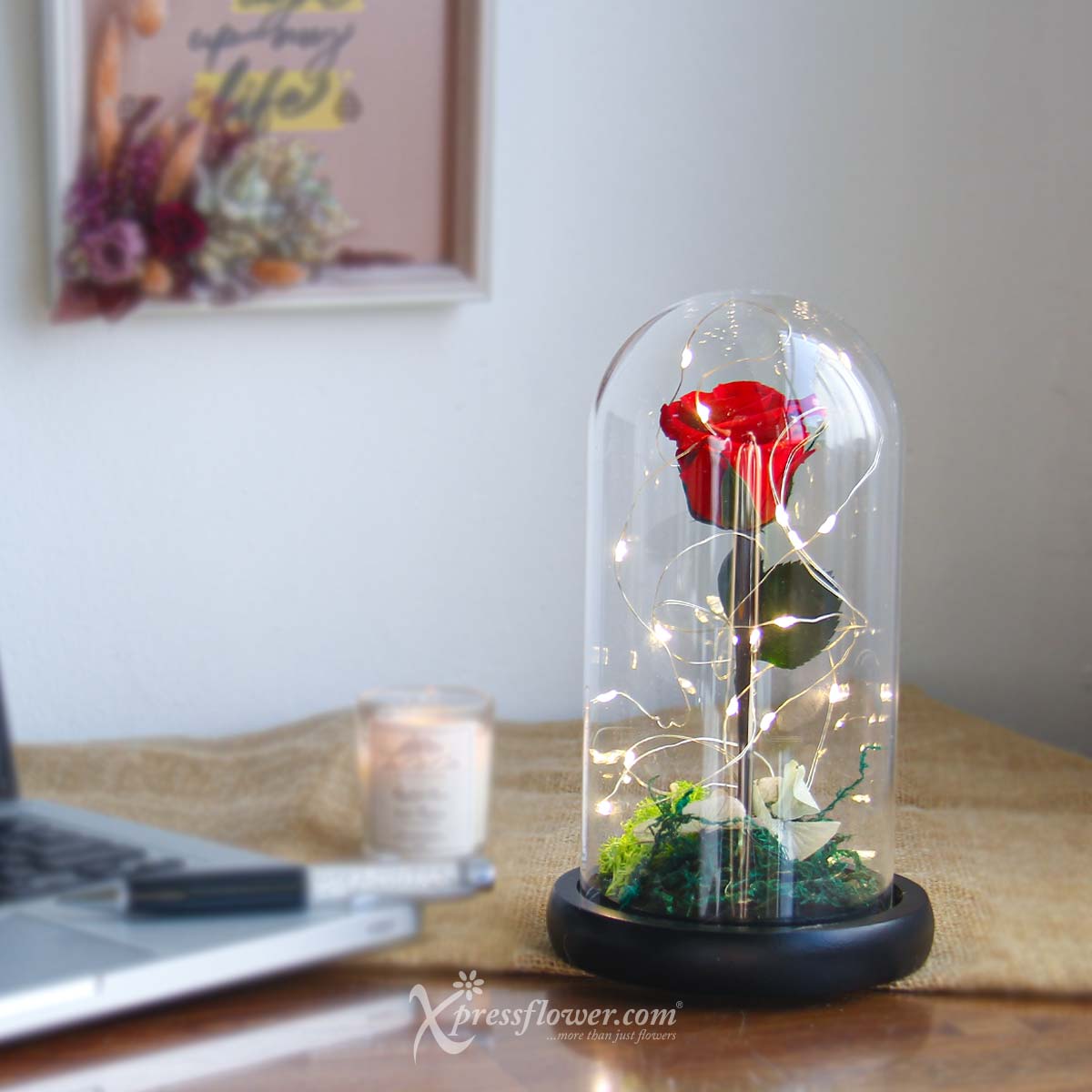 “A Rose By Any Other Name Would Smell As Sweet”. Celebrate Valentine's day with a mysteriously romantic gift that lasts! This preserved red rose in a cylindrical-shaped LED dome shines from every angle and is the perfect way to express your love. Items Included: Dome Vase LED Light Flowers Used: 1 stalk of preserved red rose and preserved hydrangea Dimension: Approx. 12cm (L) x 22cm (H) *As some contents are subject to availability, they may be replaced with similar items of equal or greater value.