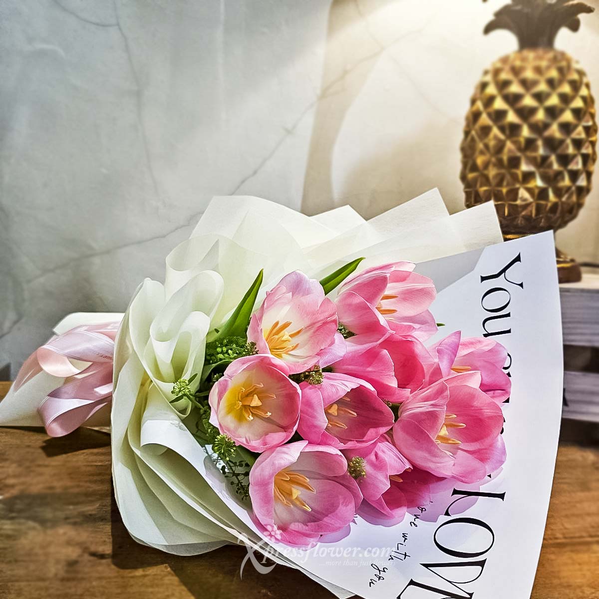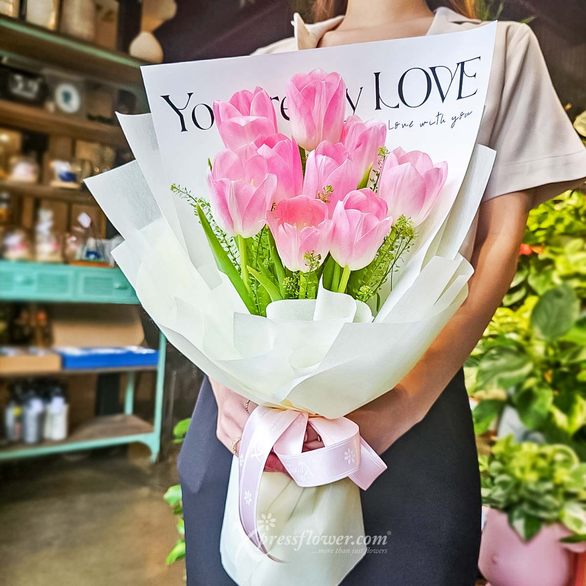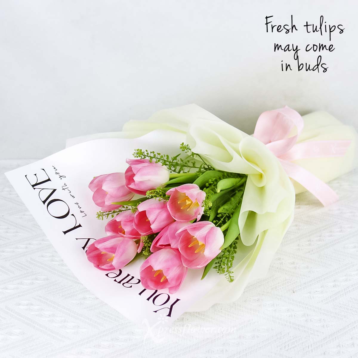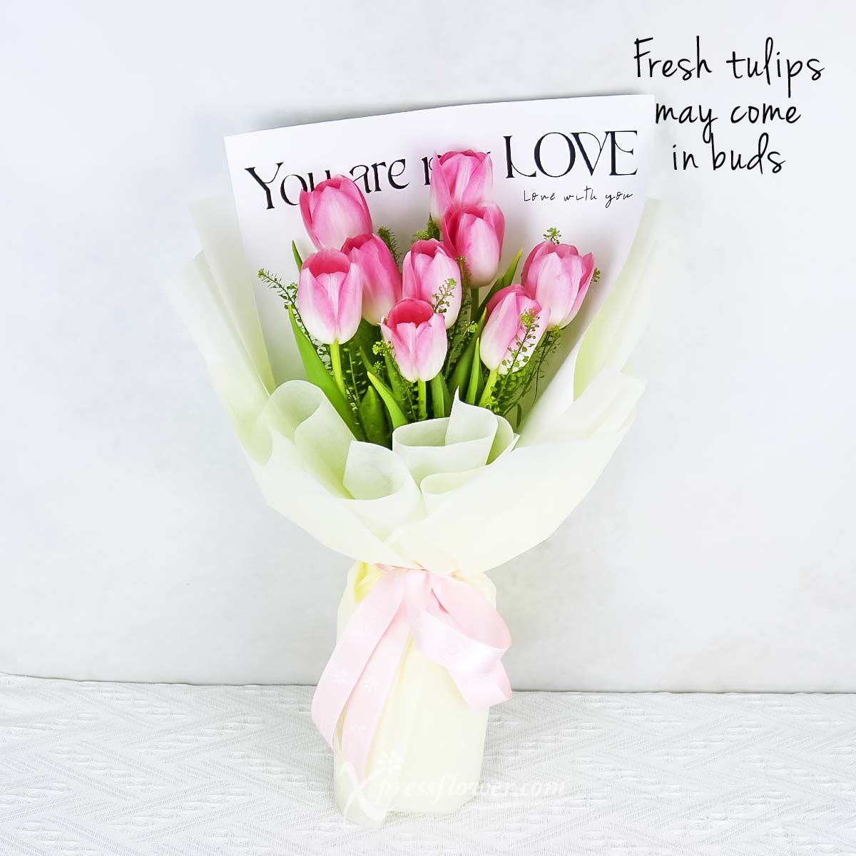 Make your loved ones' heart bloom with our fresh flower bouquet. 9 stalks pink tulips and thlaspi green bell, are beautifully wrapped in a cream 'You Are My Love' wrapper. Each tulip represents affection, good wishes, and health - perfect for expressing love and gratitude.