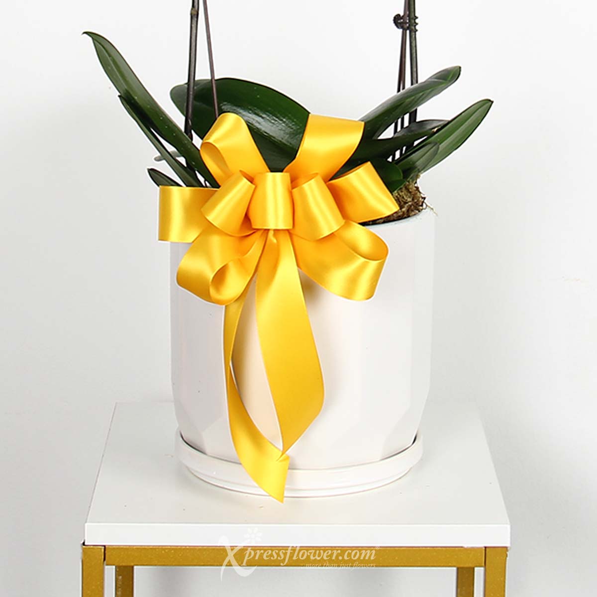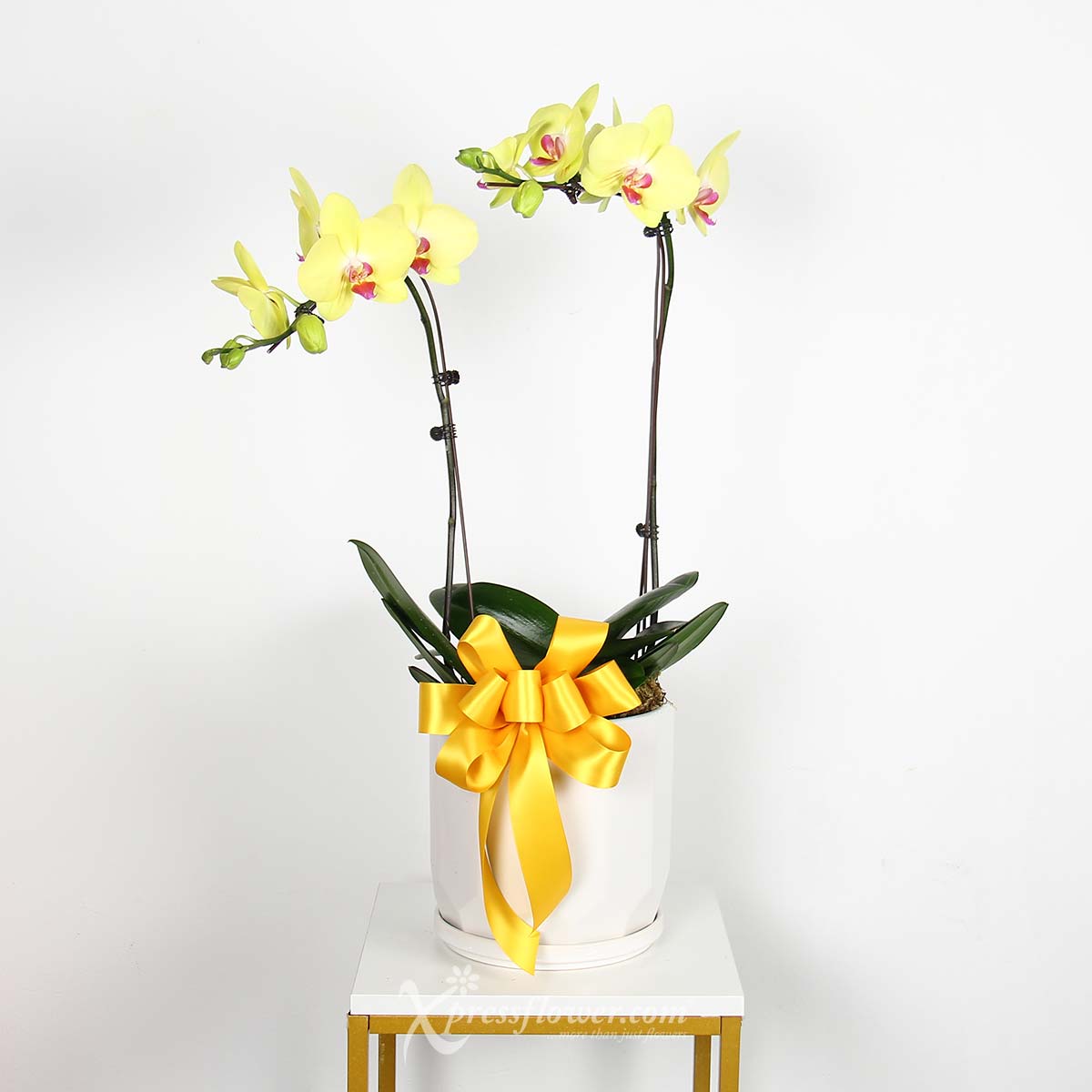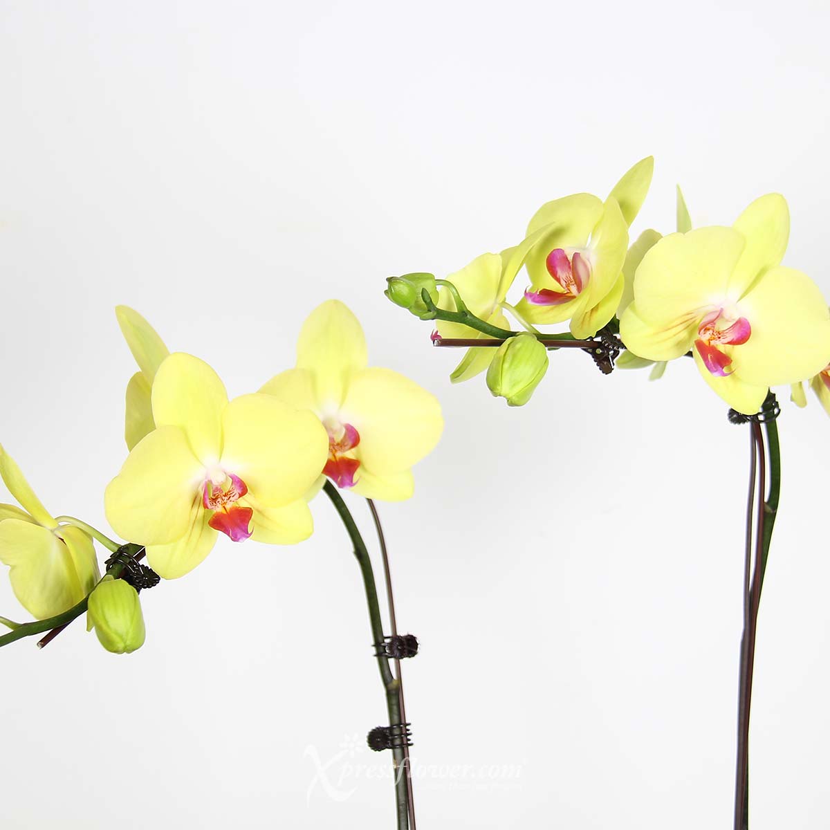 This beautiful 2 stalks yellow orchids in an elegant white vase has a vast representation of friendship, new beginnings, happiness and hope. Send the most inspiring person in your life this perfect gift to make their day