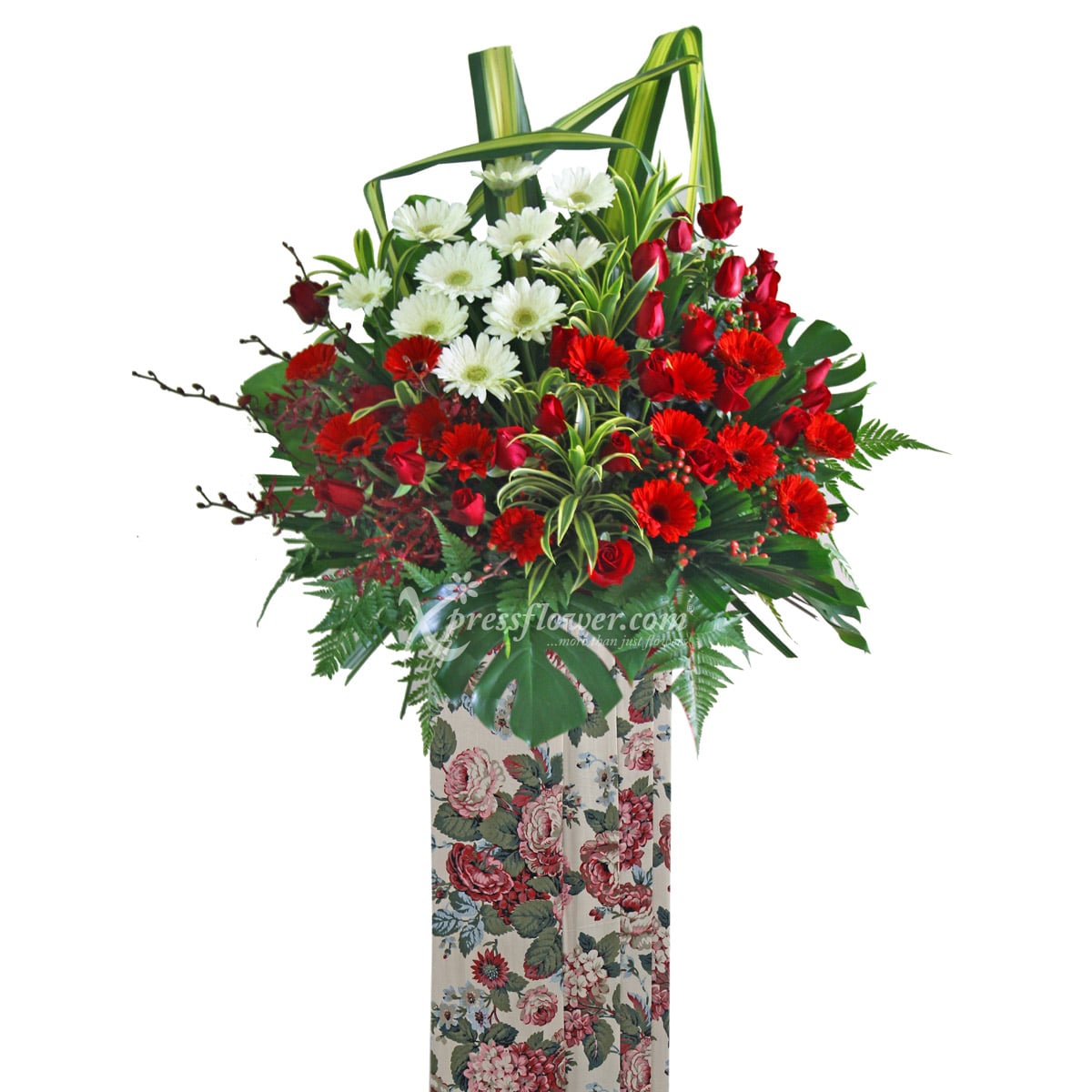 White gerberas, red gerberas, red roses, song of india, red orchid, red hypericum, pandanus leaves, monstera and johor fern.