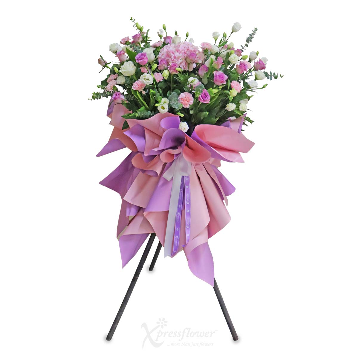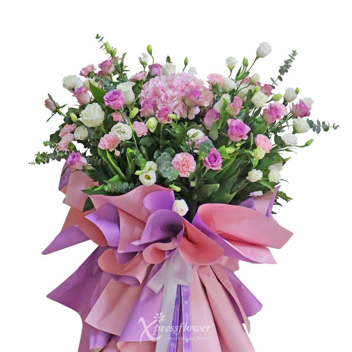 Celebrate their achievements with this beautiful pink/purple-themed Congratulatory Flower Metal Stand. A stunning blend of light pink hydrangeas, white roses yam roses, and more, beautifully displayed on a stylish metal stand. Send this beautiful congratulatory gesture today today!