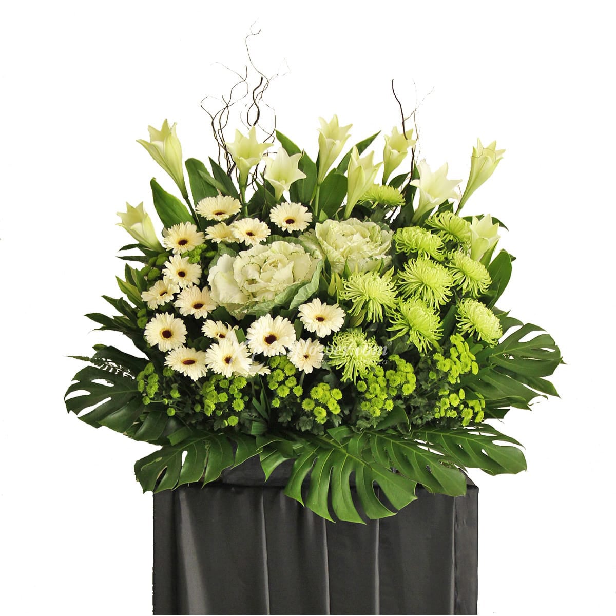 White lilium longiflorum, white brassica, white gerbera, spider green chrysanthemum, green button pom pom, Monstera, curly willow and johor fern.