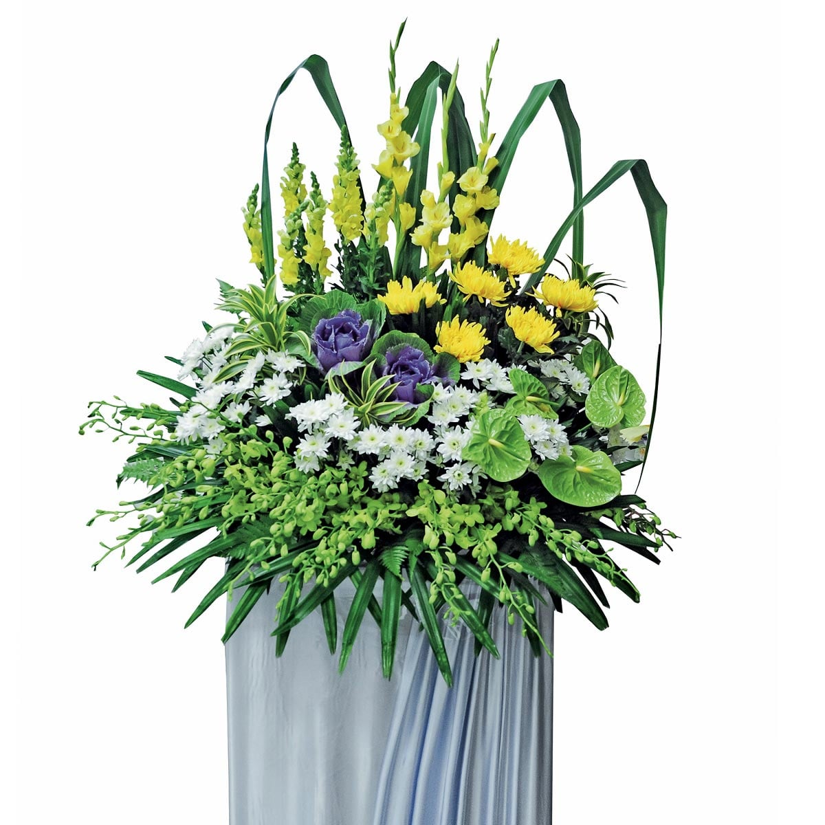 Yellow gladiolus, yellow snapdragon, yellow chrysanthemum, purple brassica, green anthurium, white chrysanthemum spray, song of india, green orchid, green pandanus leaves, finger palm and johor fern.