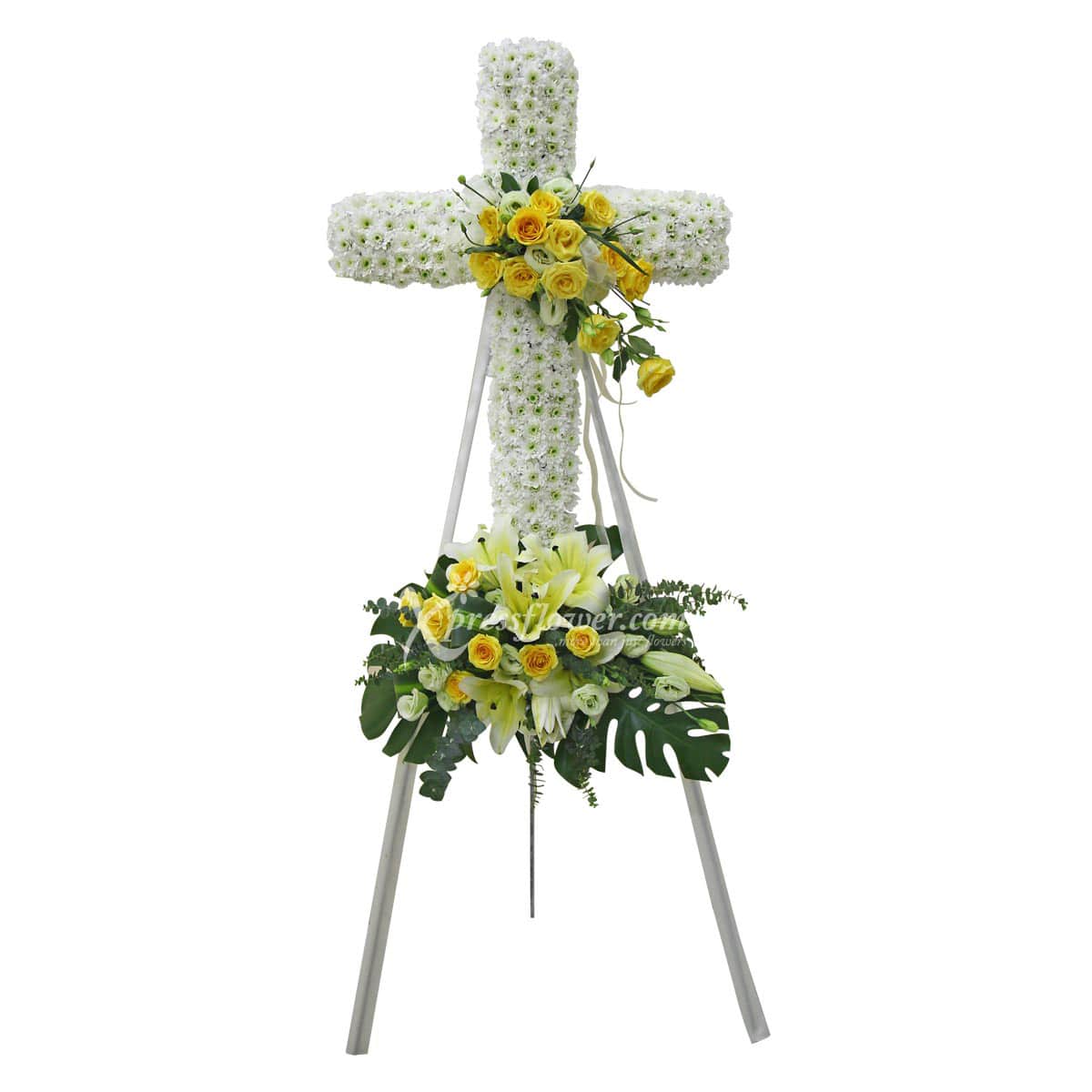 In the advent of the sorrowful farewell, you gather your gentle thoughts and prayers in a stand of pristine white lillies, chrysanthemum and comforting green foliage, composed carefully to depict the Holy Cross that will guide the passing spirit on its way.