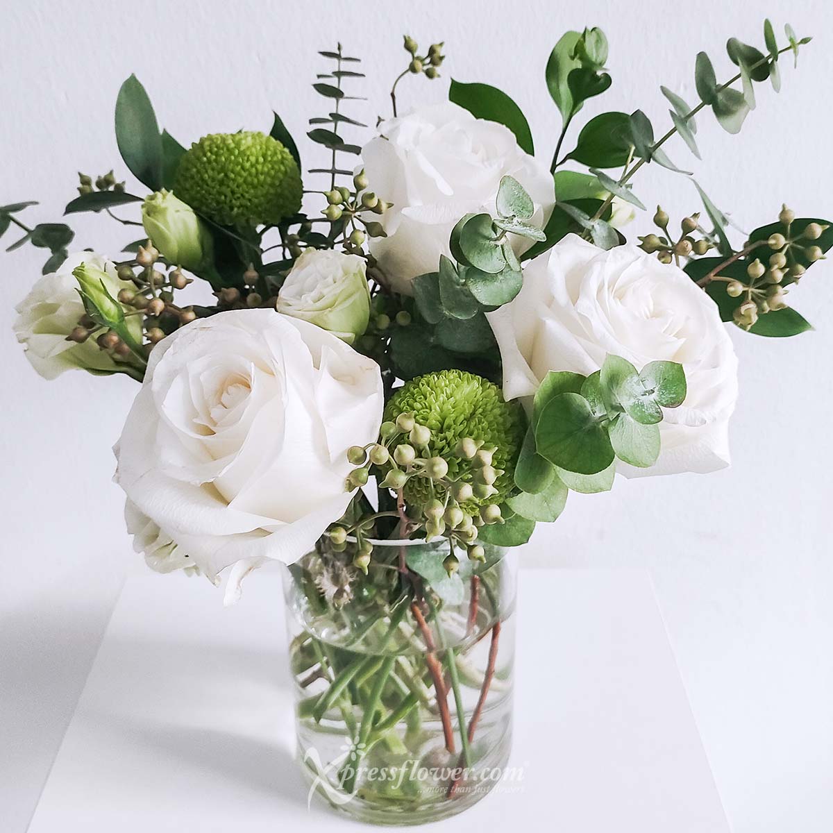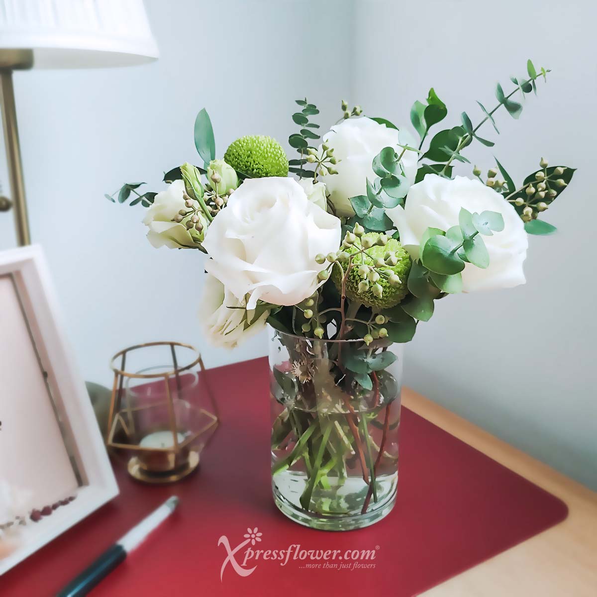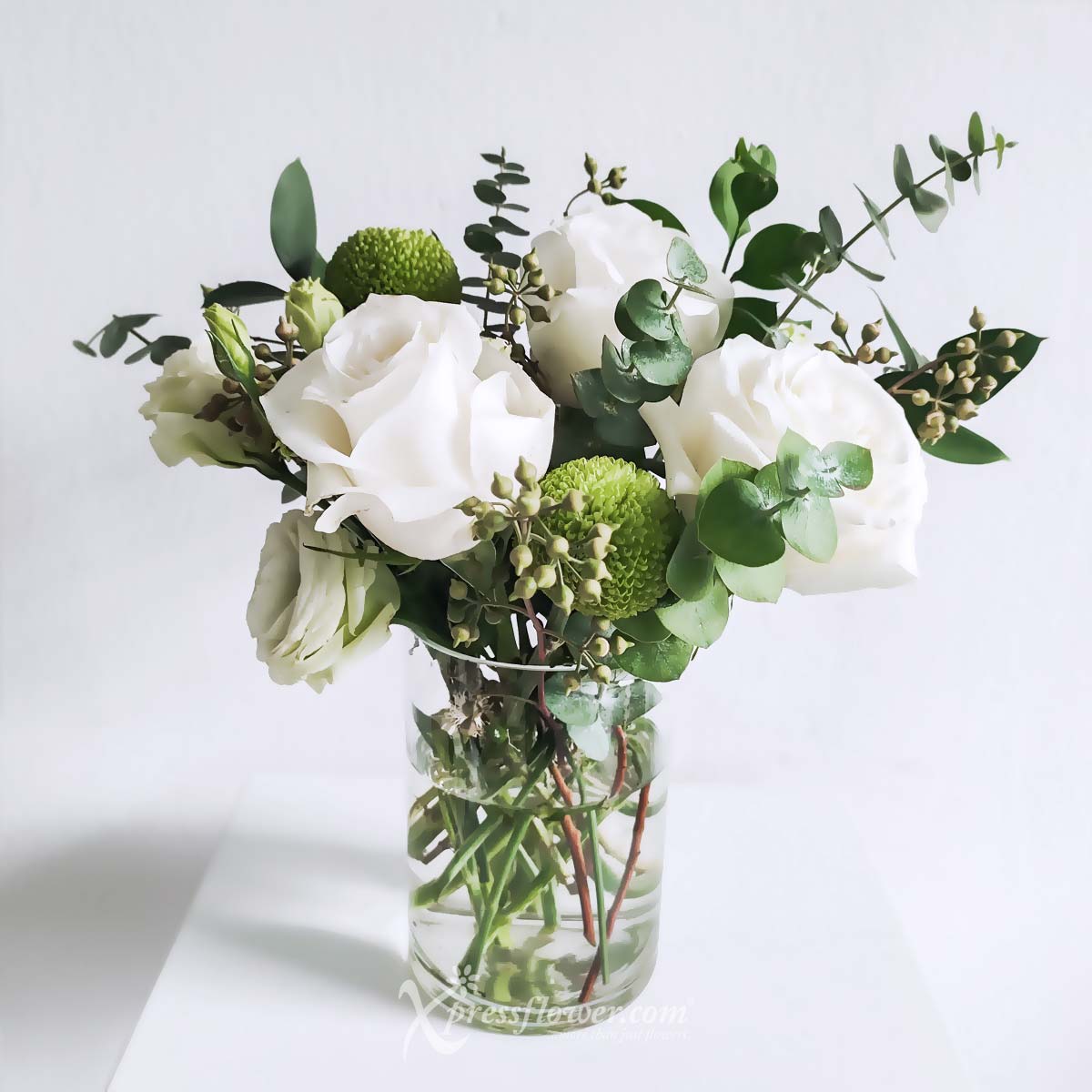 Give the gift of innocence with this sweet table arrangement which contains 3-stalk premium white roses, green eustoma and accompanying blooms beautifully arranged in a transparent glass vase with your choice of message. This makes the perfect gift for someone you love, or for yourself to symbolize purity, innocence, and eternity.
