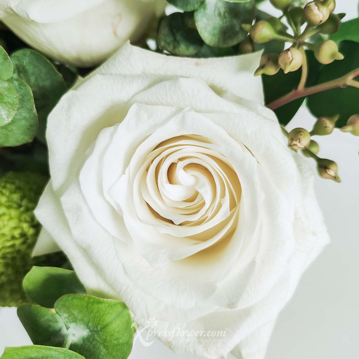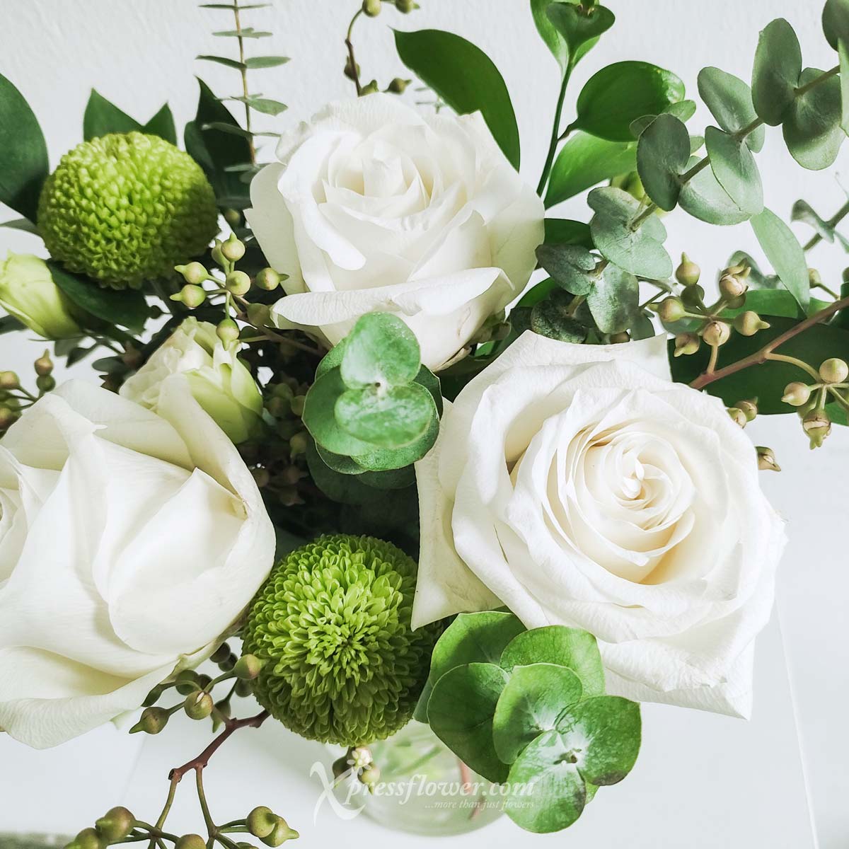 3 stalks Premium white roses, green eustoma, mi ni guo, ruscus leaves, green ping pong chrysanthemum eucalyptus coin.