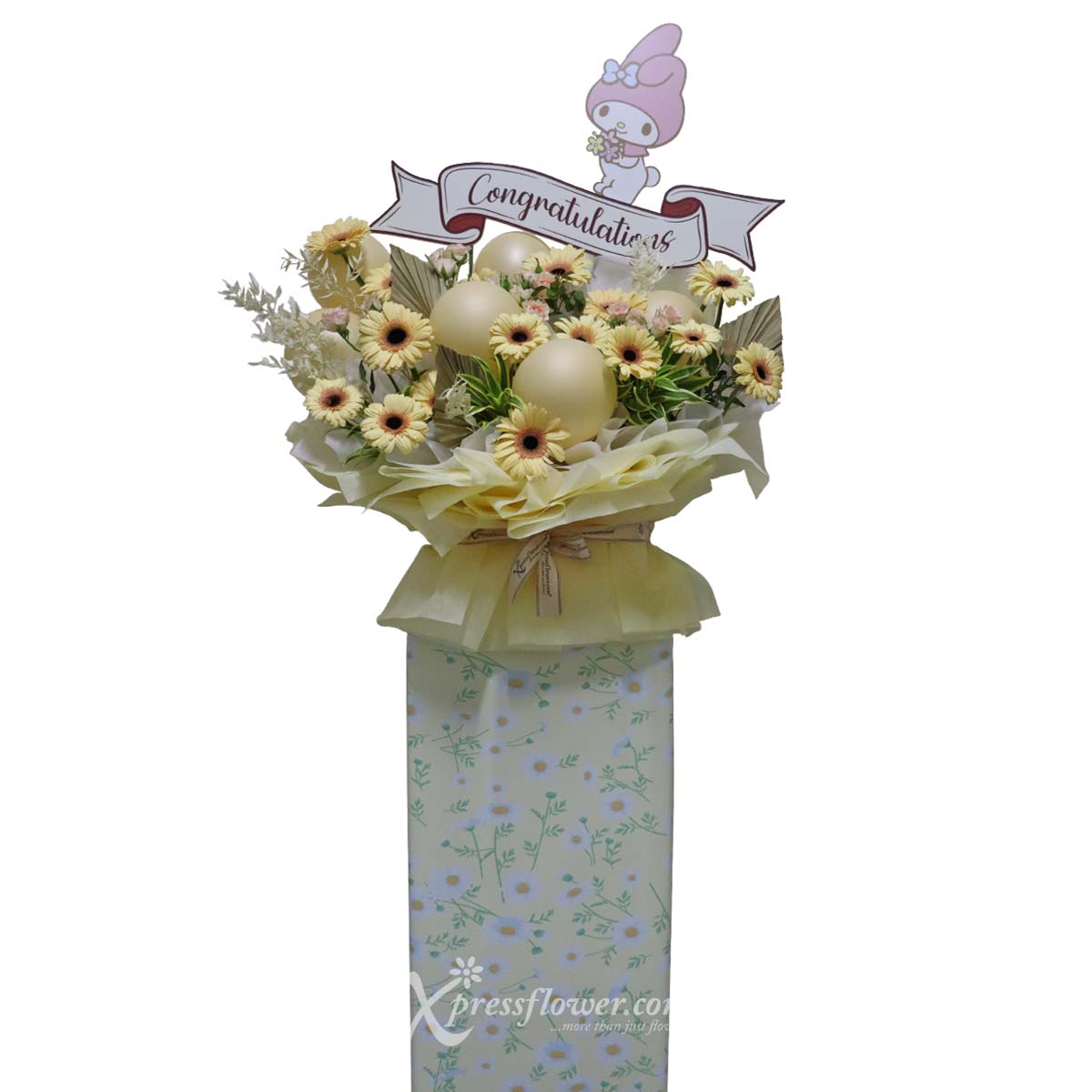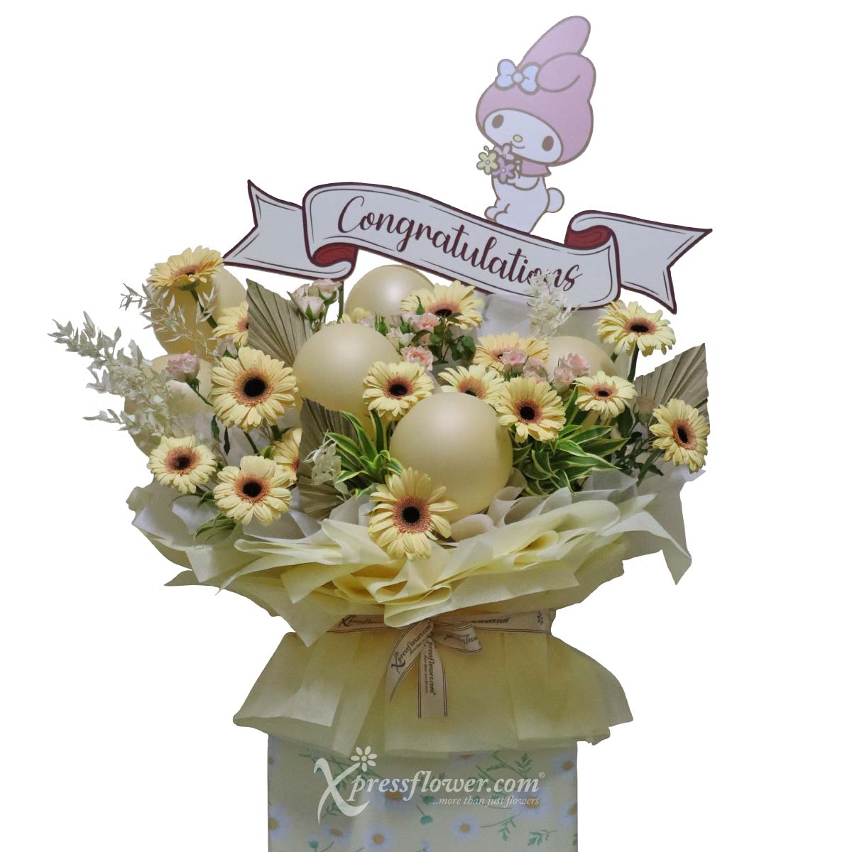 Congratulate your loved ones on their special day with a beautiful gift licensed Sanrio fresh flower congratulatory stand which is made up of cream gerberas, balloons and more! Specially curated to symbolise charm and thoughtfulness, this stand also includes a My Melody “Congratulations” decorative tag and is sure to make anyone feel special on their big day!
