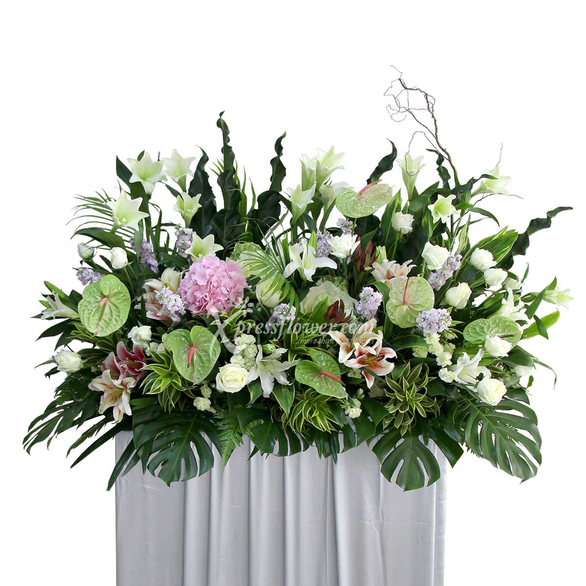 White lilium longiflorum, white lily spray, pink lily spray, white roses, hydrangea pink, brassica white, matthiola light purple, carnation spray green, leucadendron (safari sunset), anthurium green, song of india, cordyline snow white, curly willow, monstera leaves, jungle bush, soft palm leaves and johor fern.