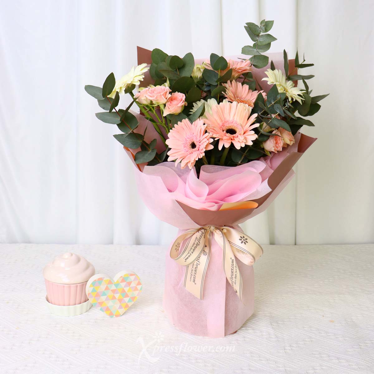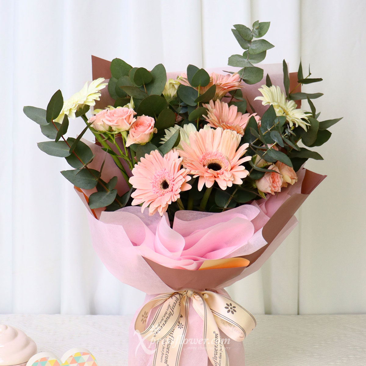6 stalks light pink gerbera, 6 stalks white gerbera, sweet sarah rose spray and eucalyptus cinerea.