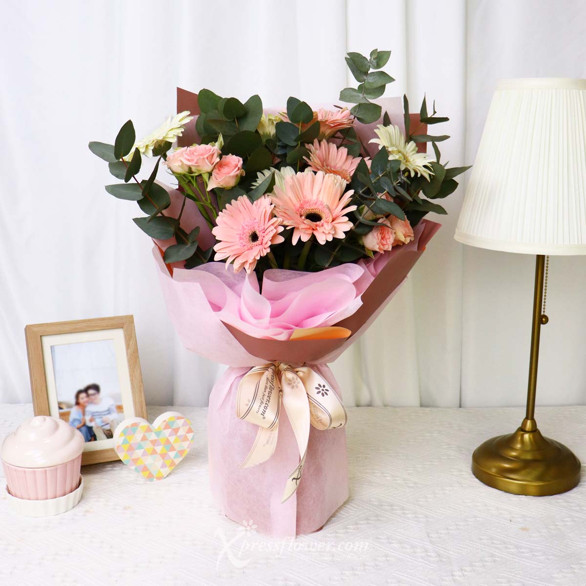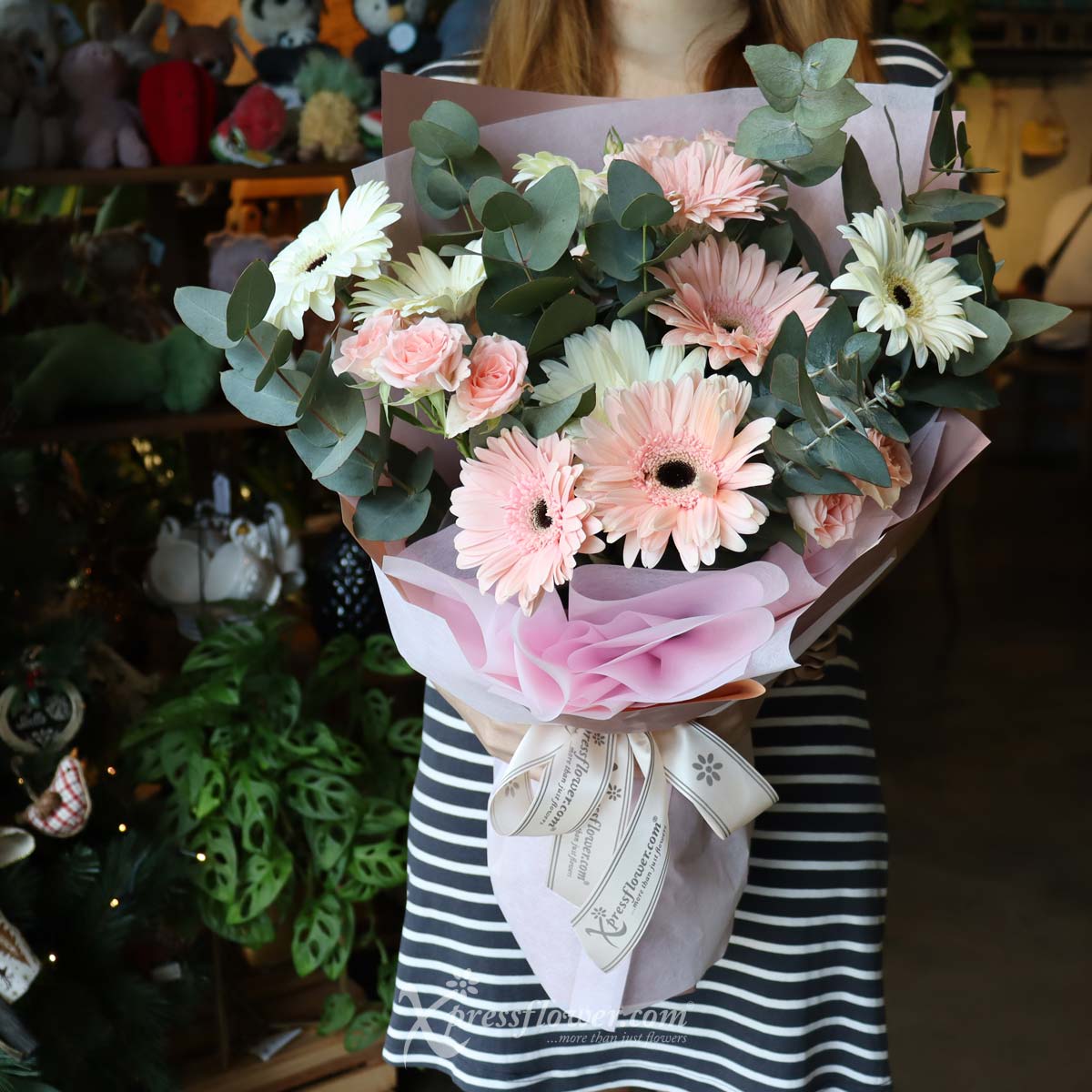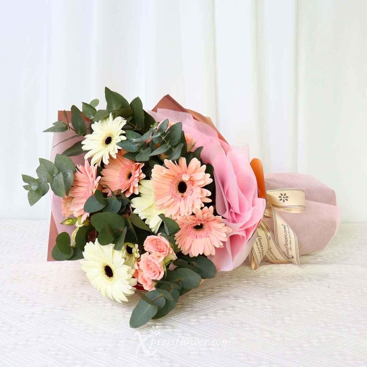 Make your occasion even more special with this bouquet of 12 stalks of mix light pink & white gerberas beautifully wrapped with accompanying blooms in a pretty pink wrapper. Representing your admiration and adoration, this bouquet makes the perfect gift to make someone feel appreciated and loved.