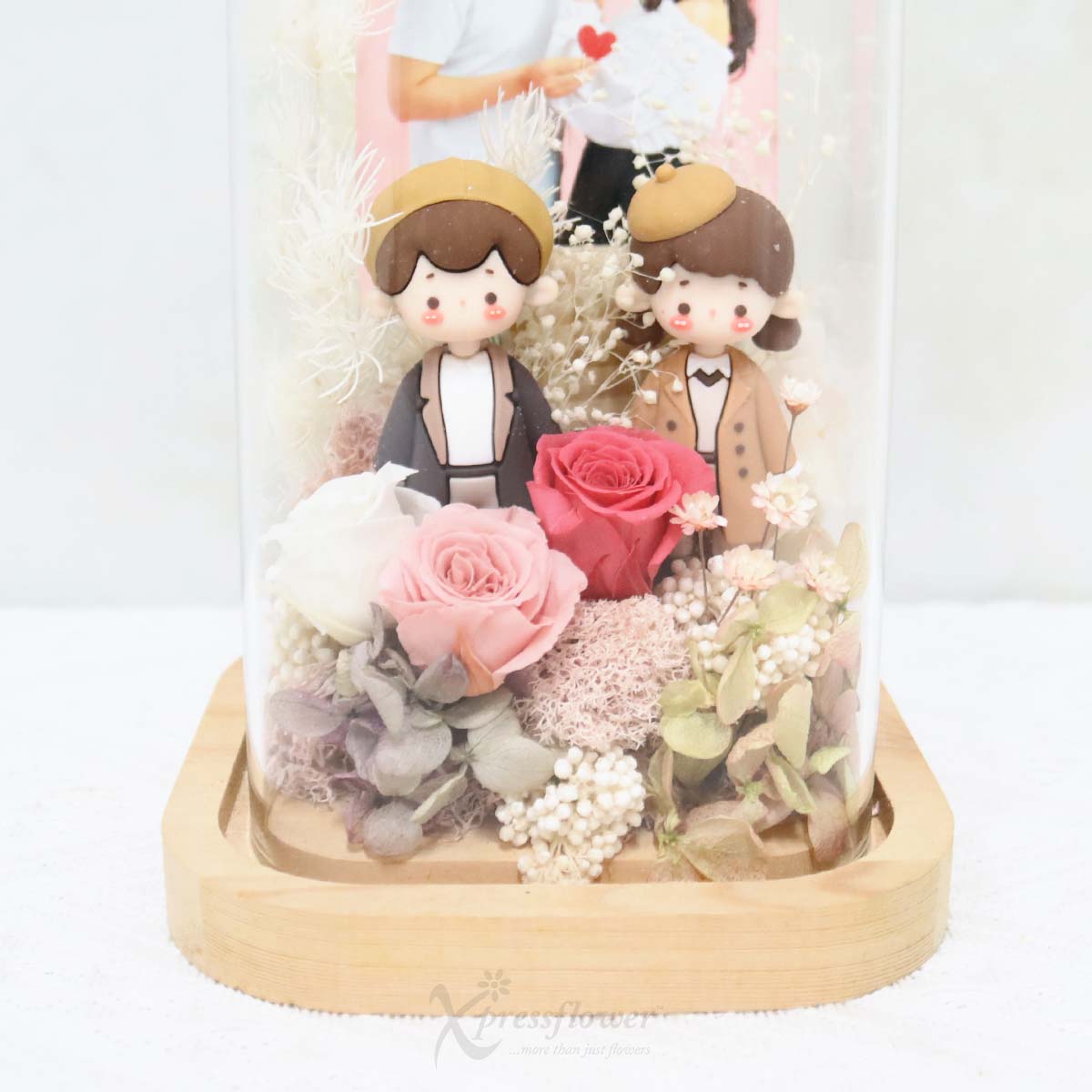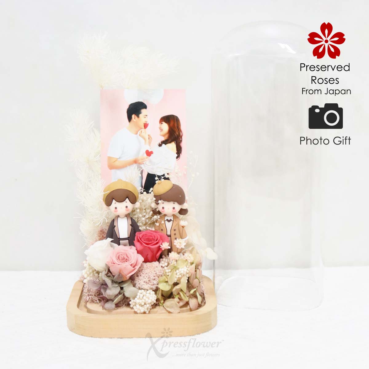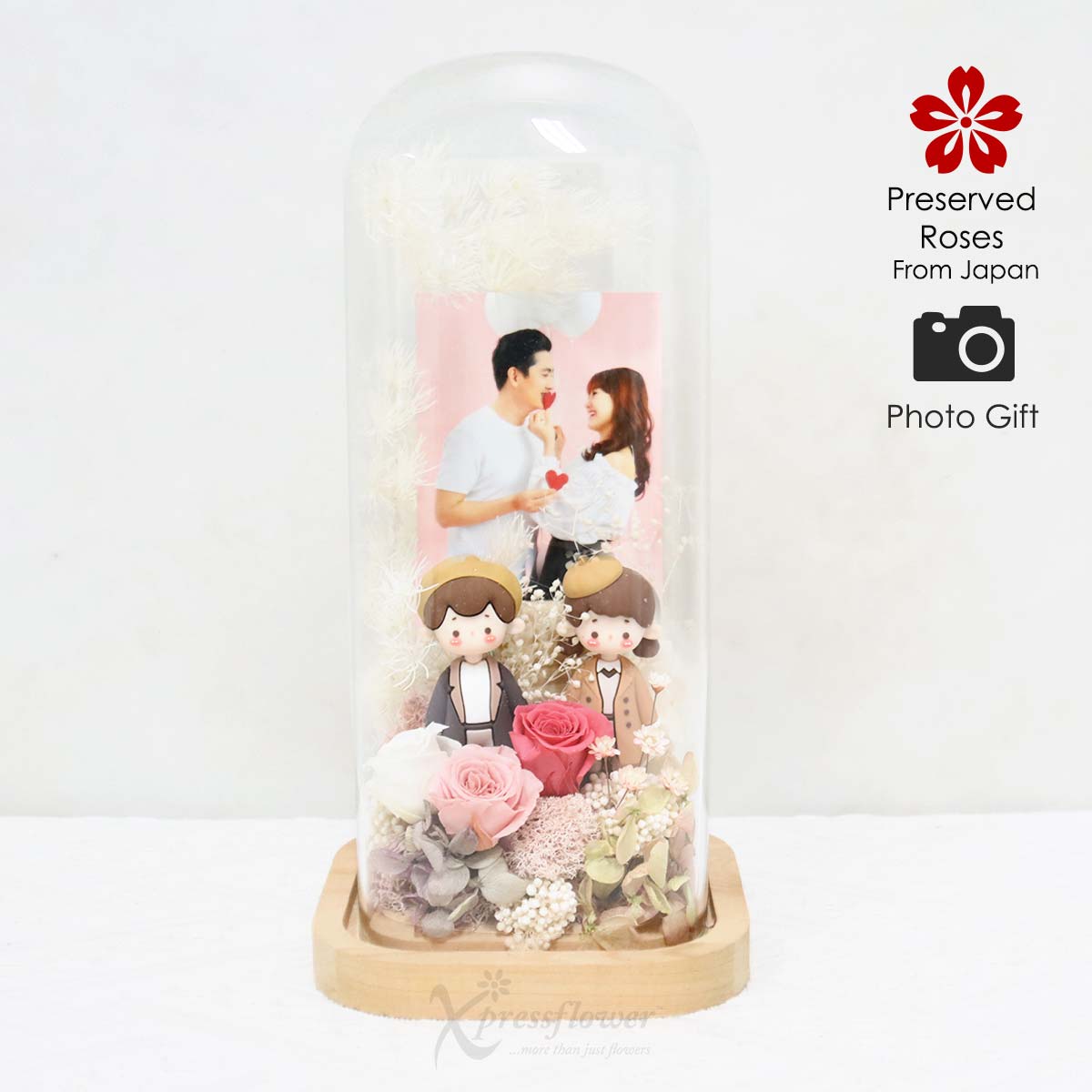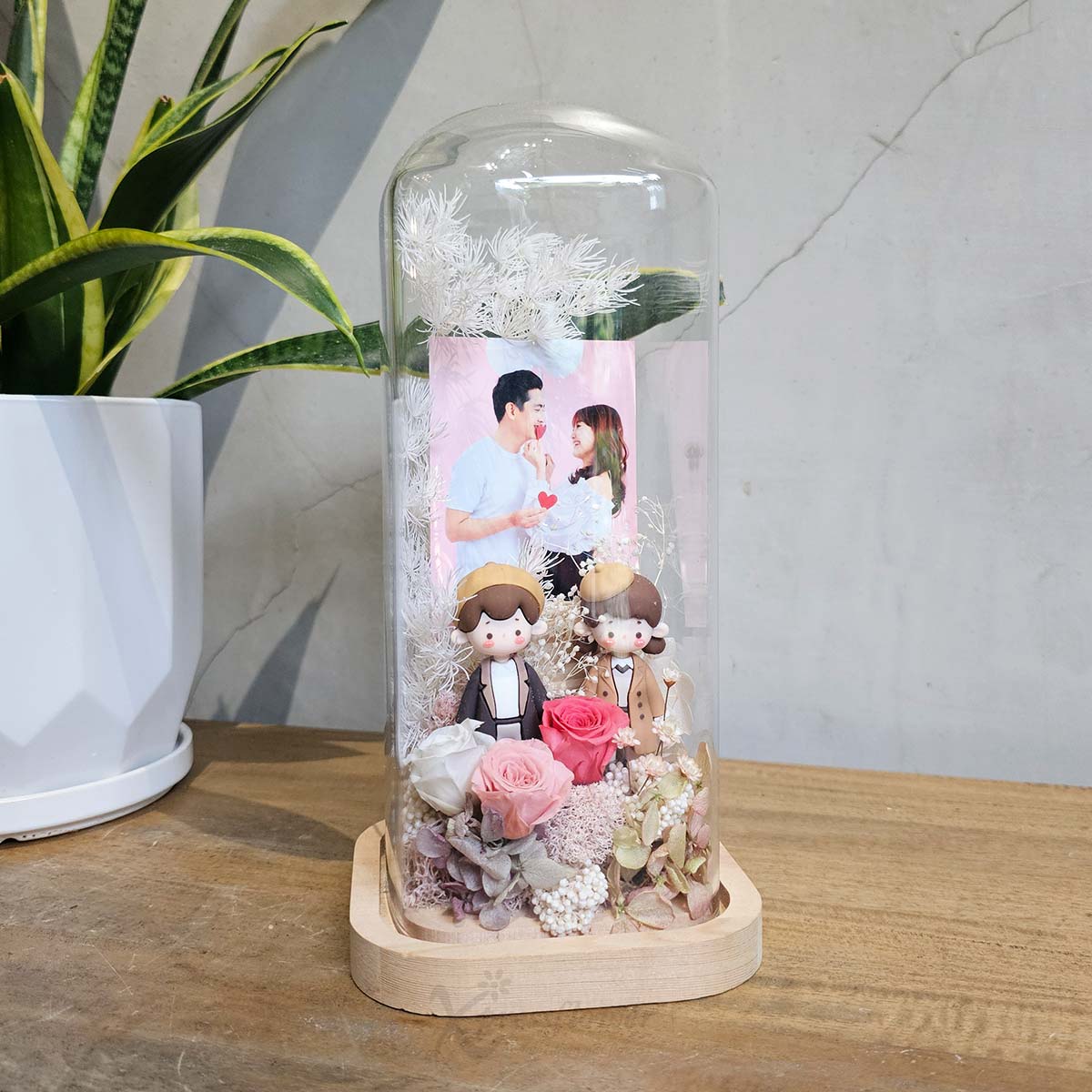 Celebrate your love story with this charming preserved flower dome. Featuring white, pink, and dark pink roses, a cute couple figurine, and a personalized photo print, it’s a timeless romantic gift to treasure forever, beautifully arranged in a dome.