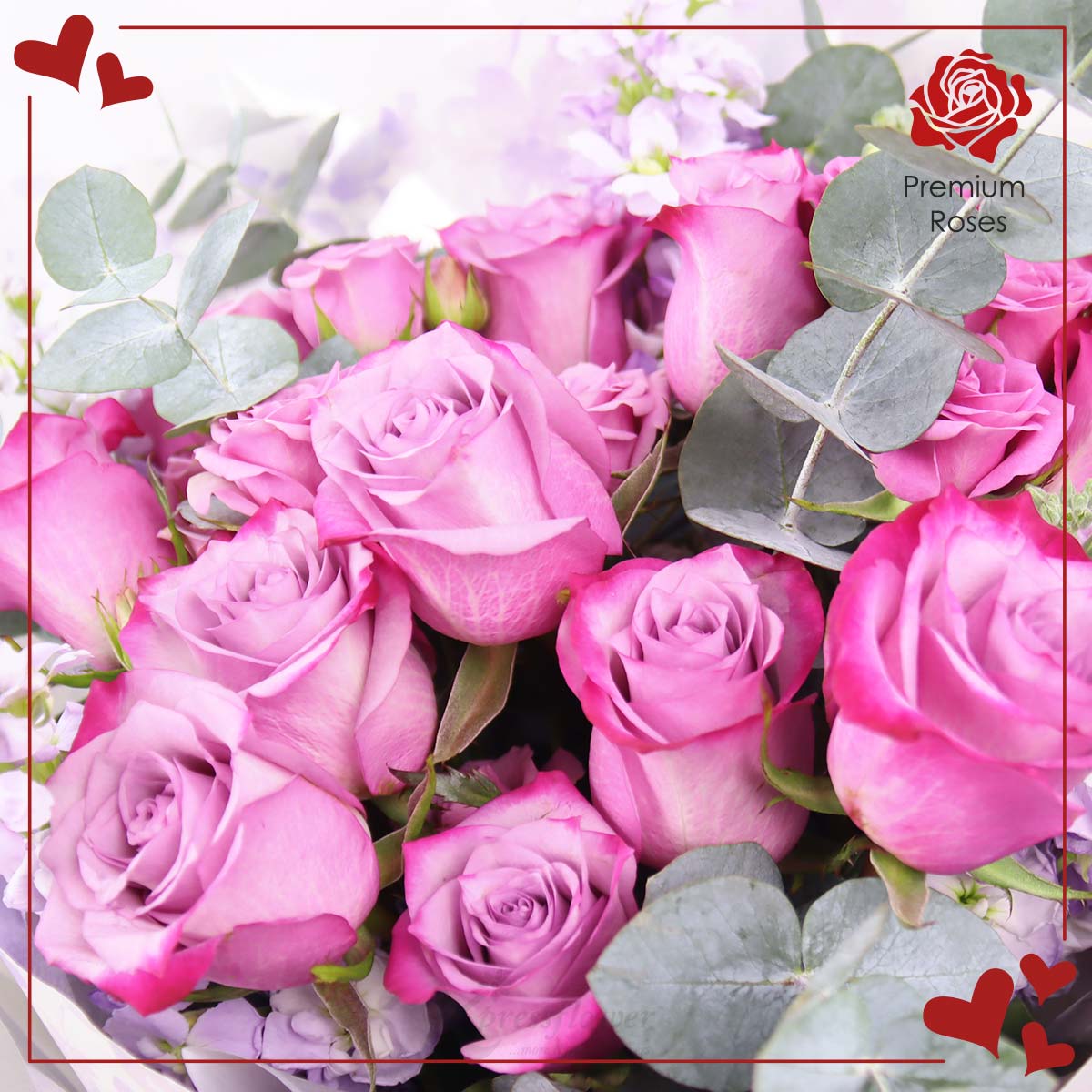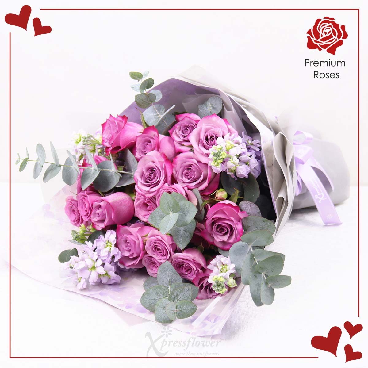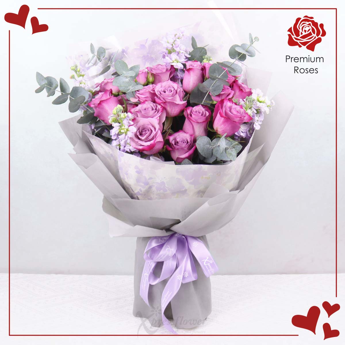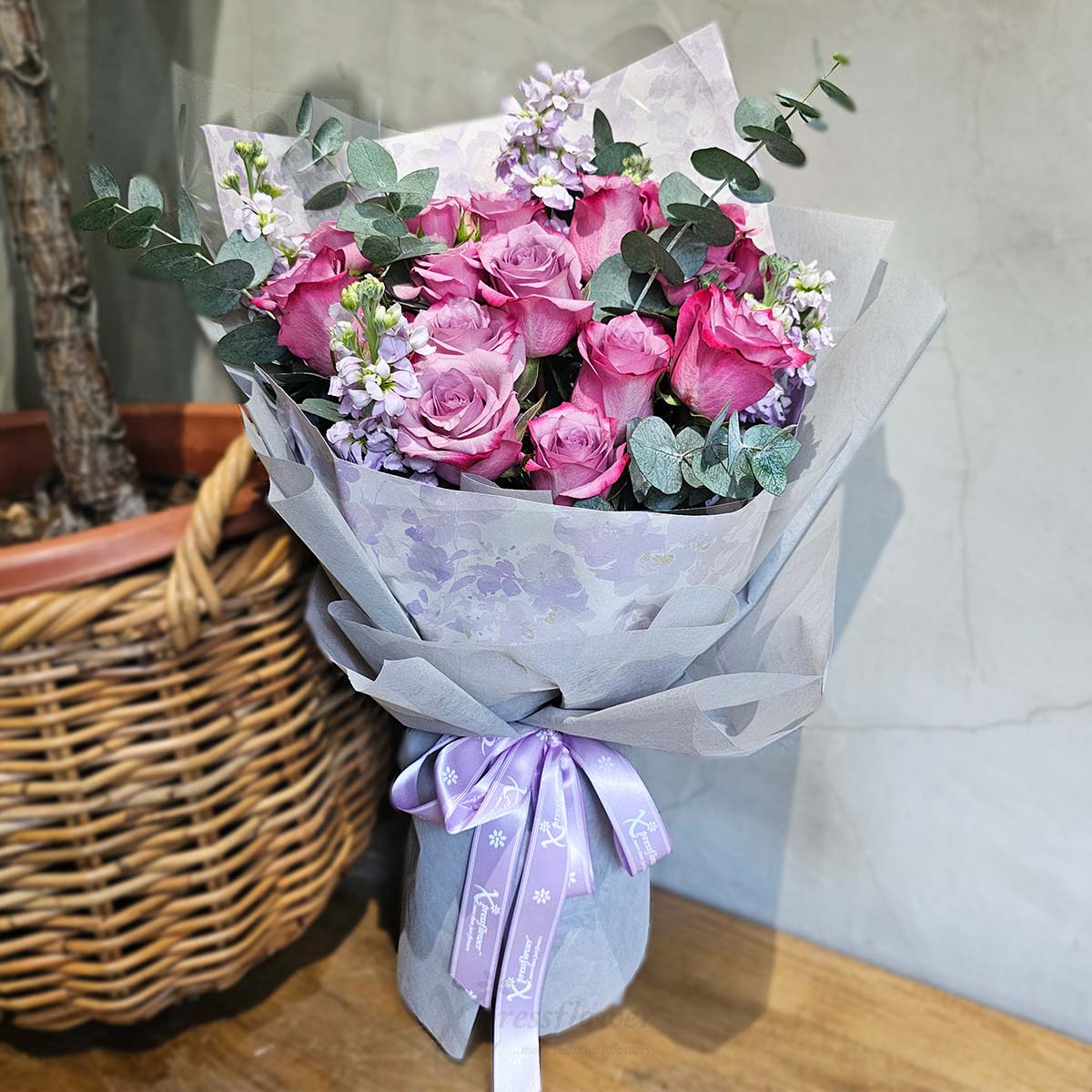 Reignite fascination with this elegant fresh flower bouquet of 12 stalks yam roses, lilac rose spray, light purple matthiola, and eucalyptus cinerea. Beautifully wrapped in grey and light purple paper with a cream lilac ribbon, it’s a heartfelt Valentine’s gift for your sweetheart.