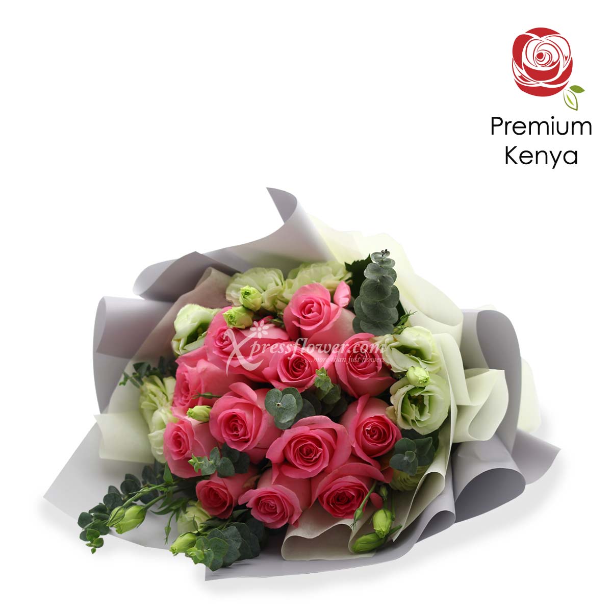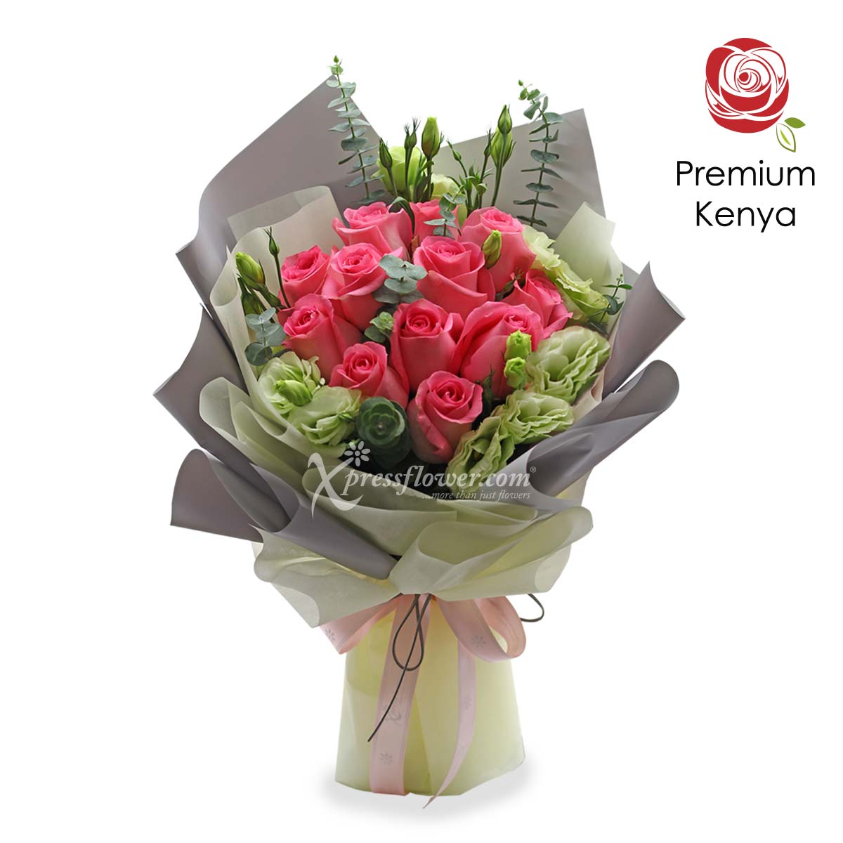 12 stalks dark pink roses, green eustoma and eucalyptus coin.