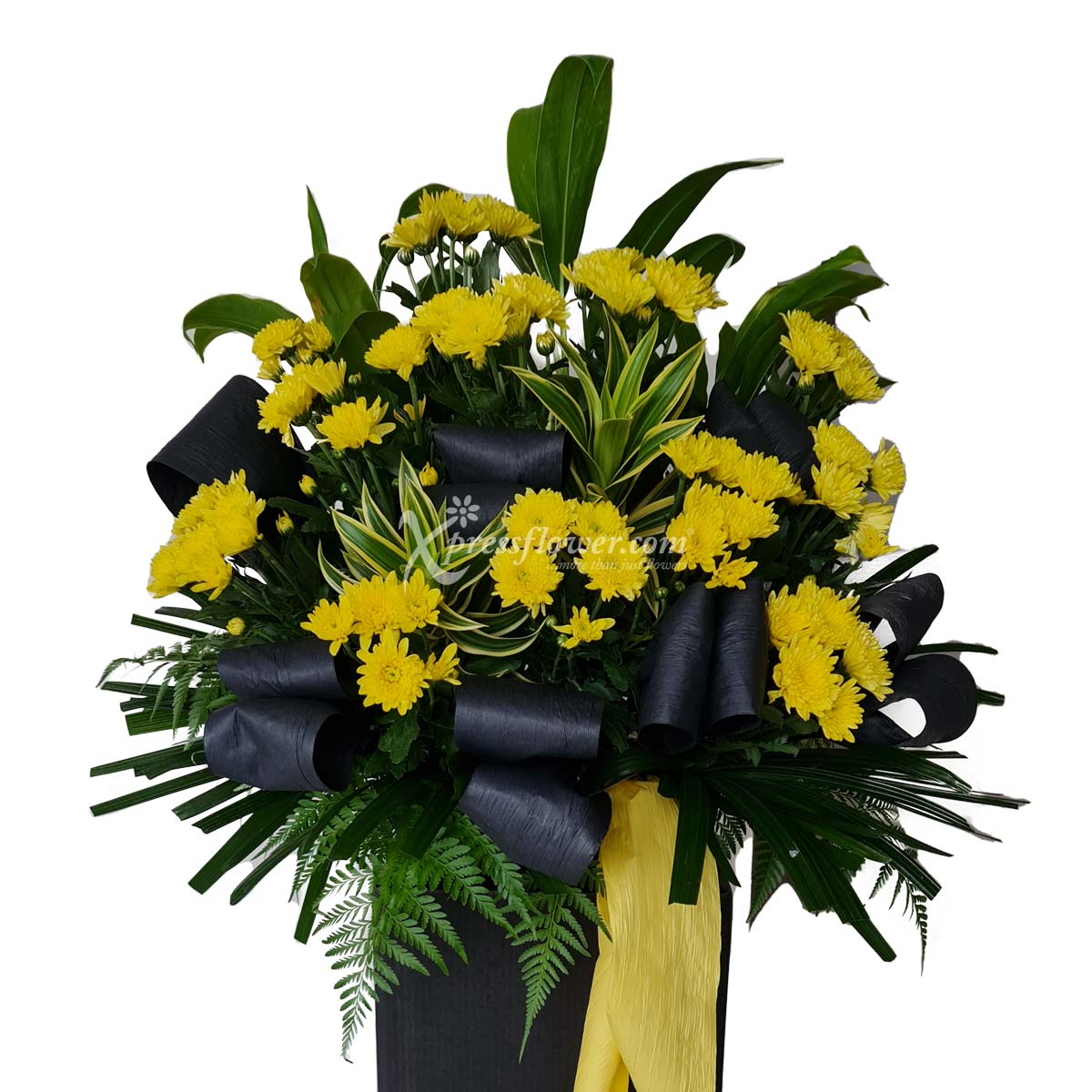 When a loved one passes away, express your support and comfort to the bereaved family during the difficult time and let them know that they’re not alone in their grief. Flowers used: Yellow chrysanthemum spray, song of india, cordyline, finger palm. Dimension: Approx. 60cm (L) x 160cm (H) Base Used: Black Printed Box Stand *As some contents are subject to availability, they may be replaced with similar items of equal or greater value.
